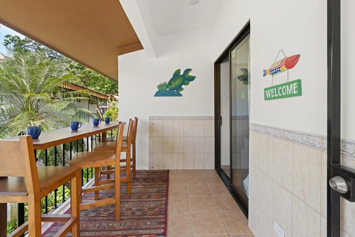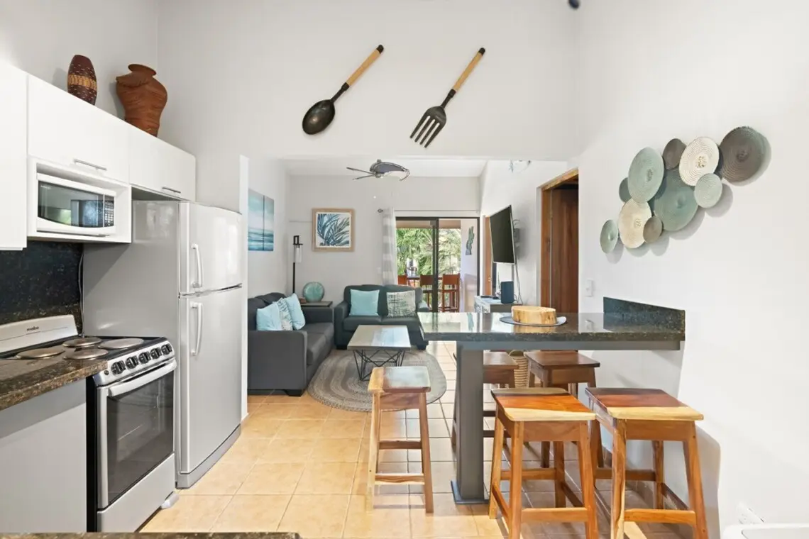 Enjoy pool & nature view front balcony, open living/kitchen/dining space, and interior dining space for 5. After a day at the beach, relax in the comfortable living space and cook (or enjoy delivery/takeout!) in the fully equipped kitchen.