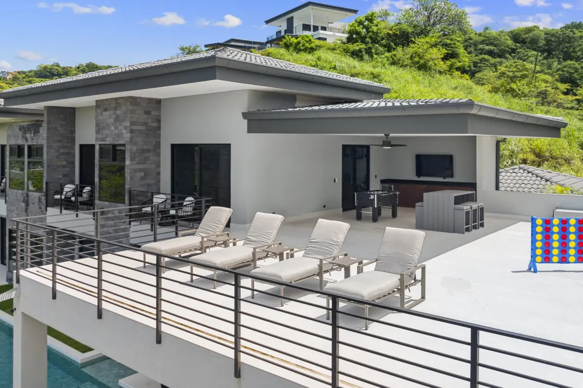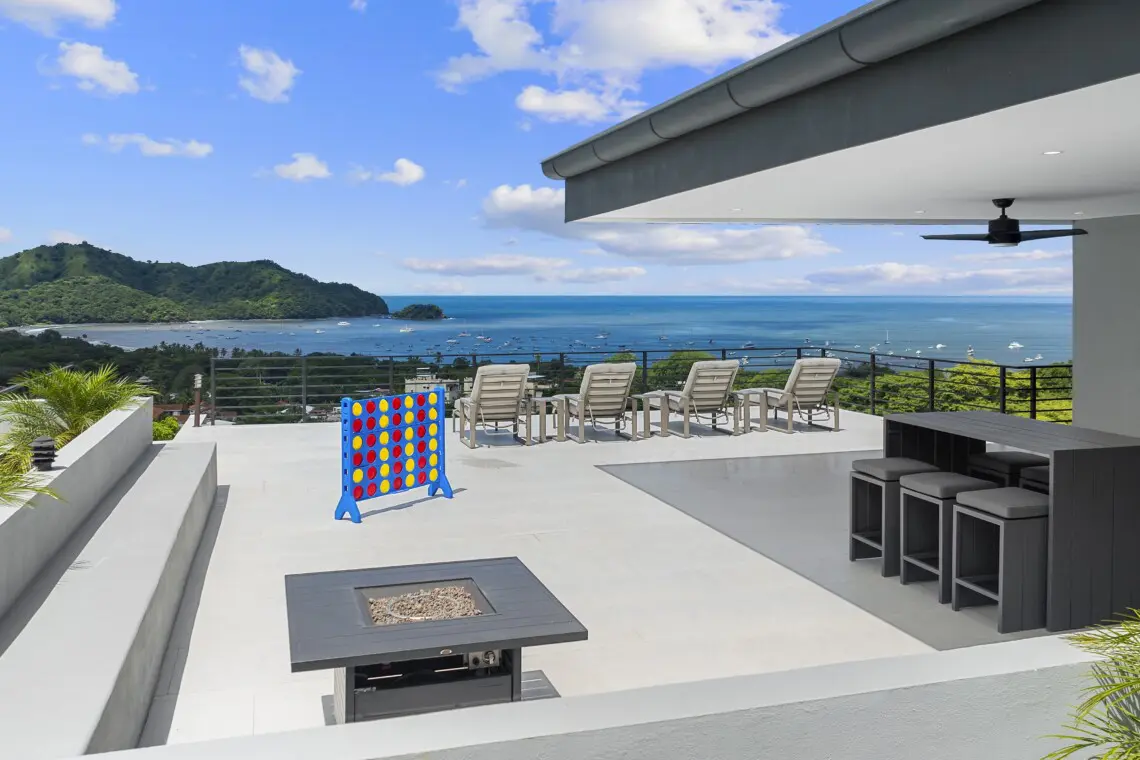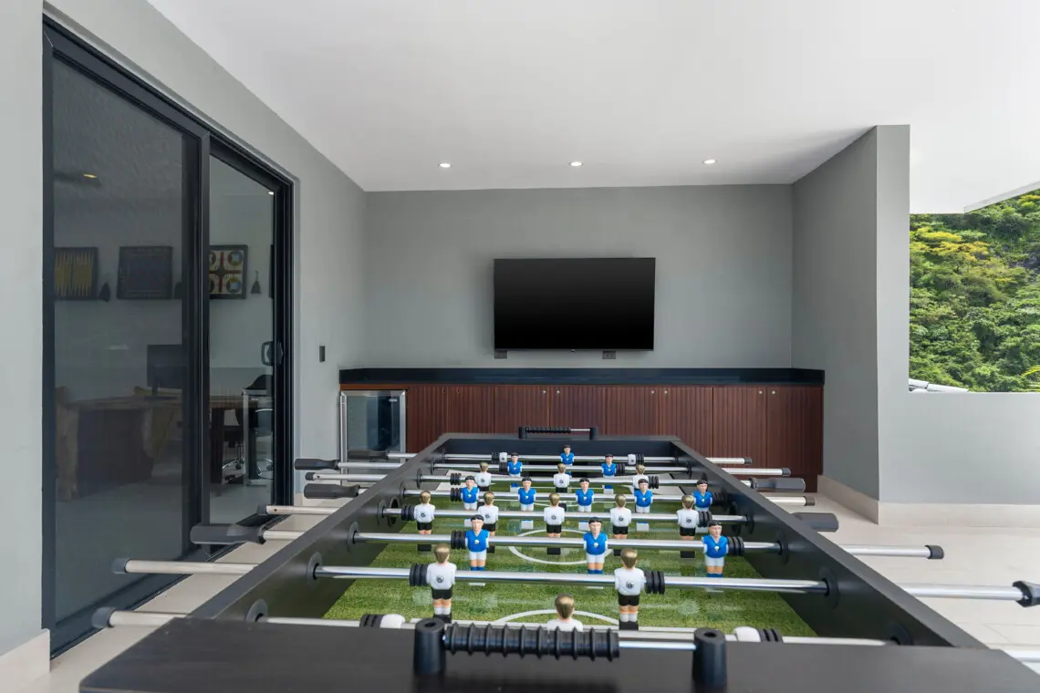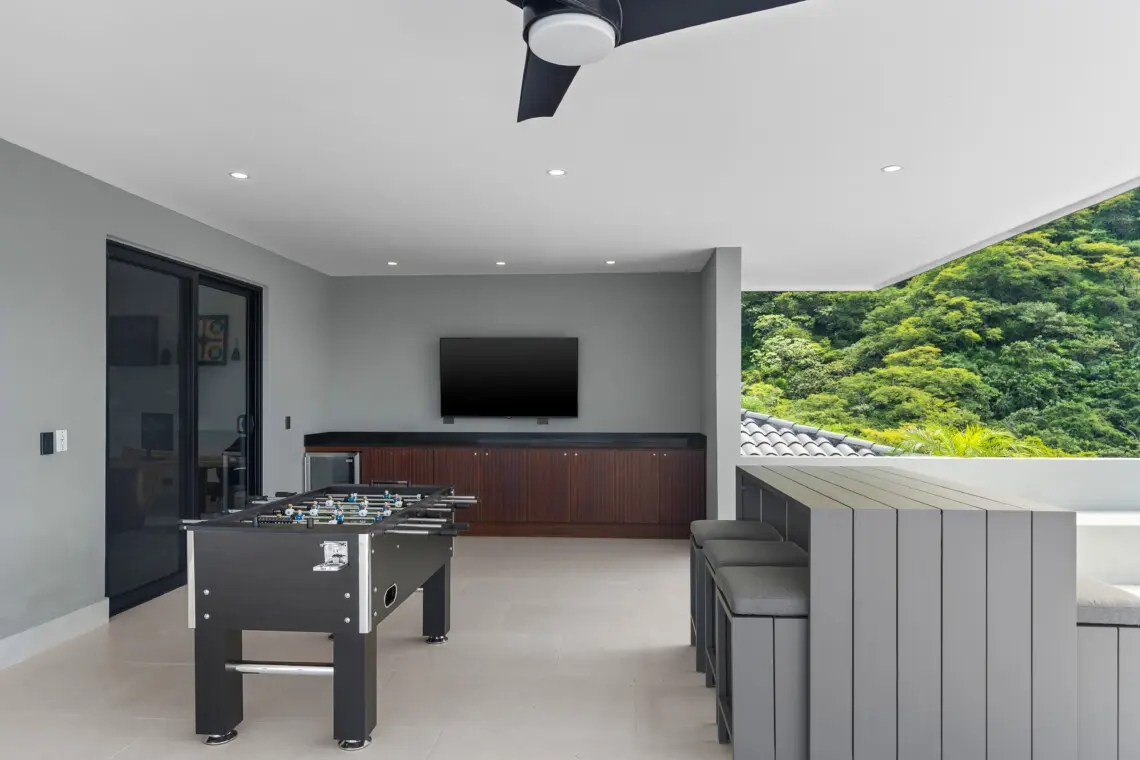 – Upper-level terrace with 63″ TV, bar fridge, high top table, fire table, GIANT Connect 4, plus a foosball table