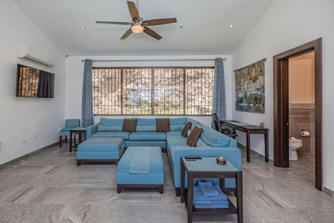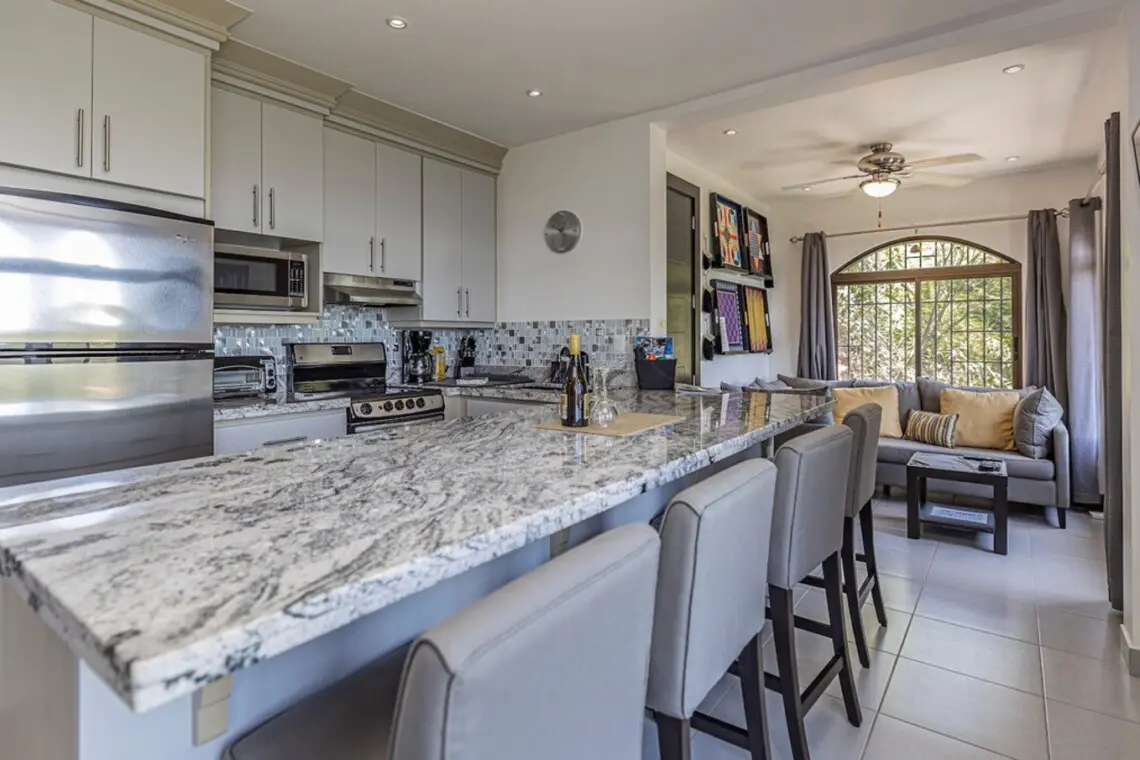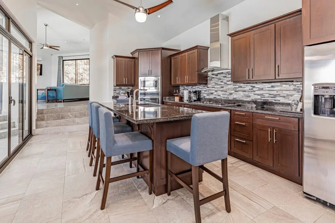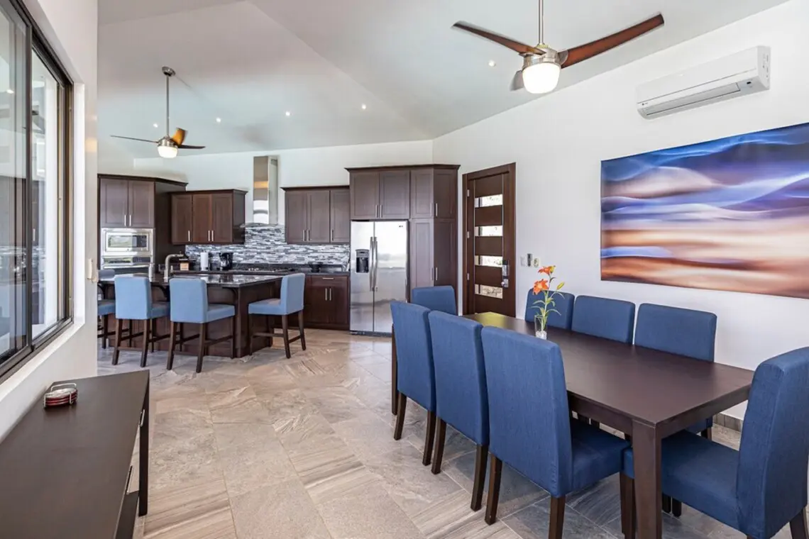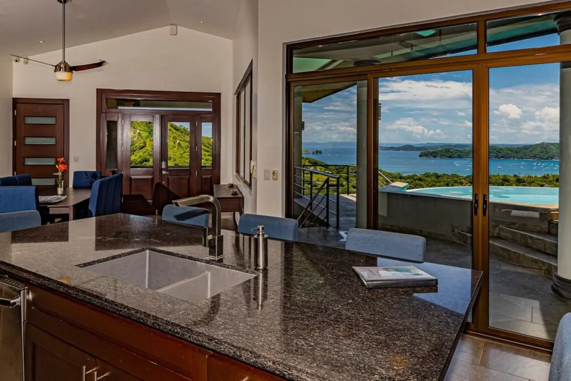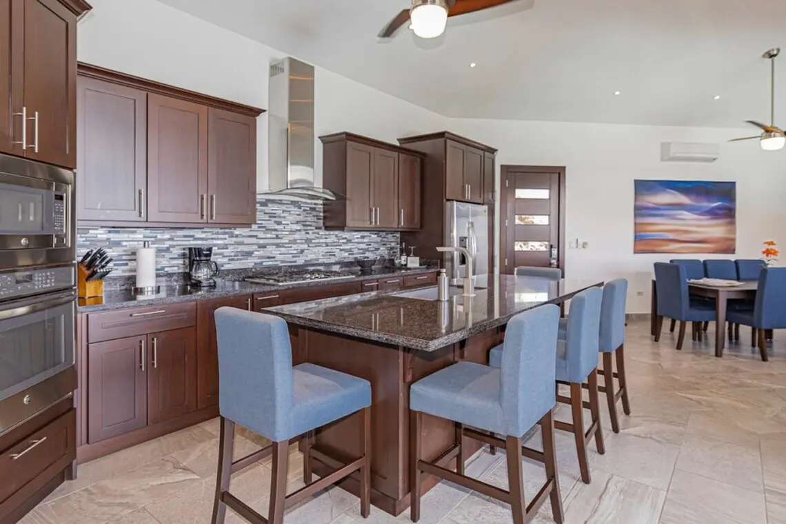 The main living area starts on level 3 with a large, covered outdoor kitchen and grilling area plus a small dining space and fantastic views of Playas del Coco and the surrounding mountains. Upstairs, the main home encircles the oceanview pool with in-pool seating at the infinity edge for gazing out at the ocean and the lush landscape surrounding the home. The u-shaped, covered terrace provides shade and plenty of space for relaxing with both lounge chairs and conversation seating. The south wing of the home begins with the living space with a large sectional sofa and Smart TV, perfect for watching the game or having a movie night. There is a half bath just off the living room before you head down a few stairs to the open kitchen. Stainless steel appliances, breakfast island seating for 4 and everything you need to whip up a great dinner on vacation – or let us hire a local chef to do the cooking! Just beyond that is a beautiful dining table that seats 8. All of the living, kitchen and dining spaces offer views of the pool, the terrace and the Pacific Ocean beyond.
