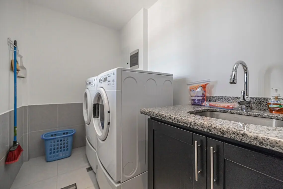 But wait! The tour isn’t over yet! The 2nd level of the home has a standalone apartment with ocean views, a full kitchen with breakfast bar seating, a living area with Smart TV, and a queen bed. There is also a Murphy bed for additional sleeping space and when in the upright position, it has a small desk space that folds down. The apartment has a 3-piece bathroom and private laundry as well. On the ground level is a private 2-car garage.