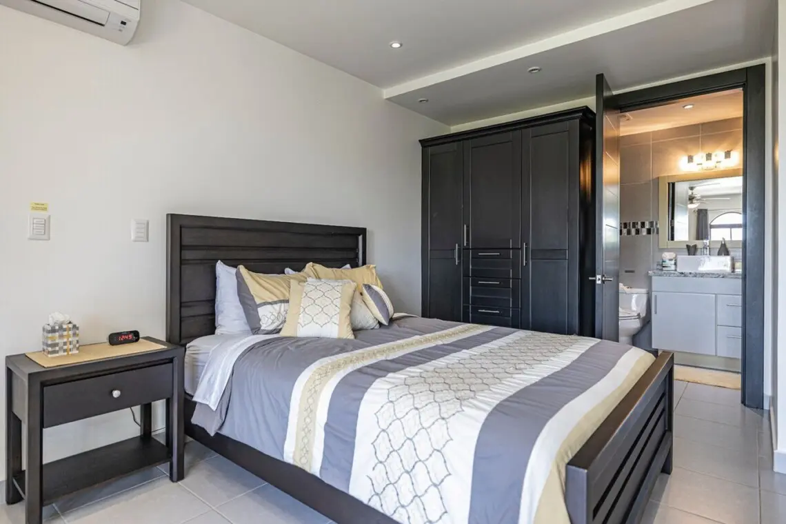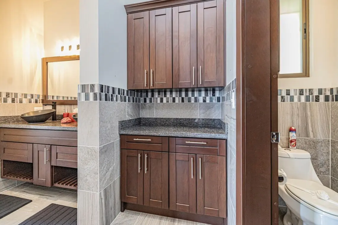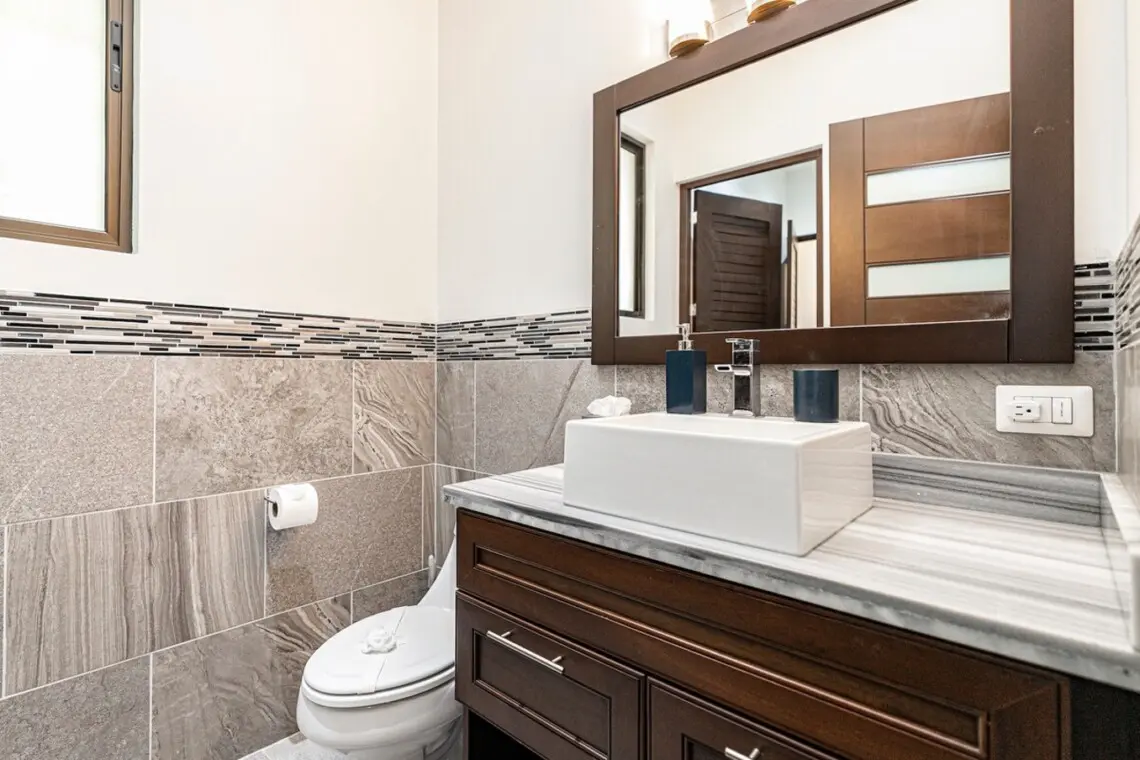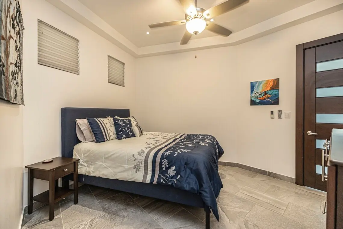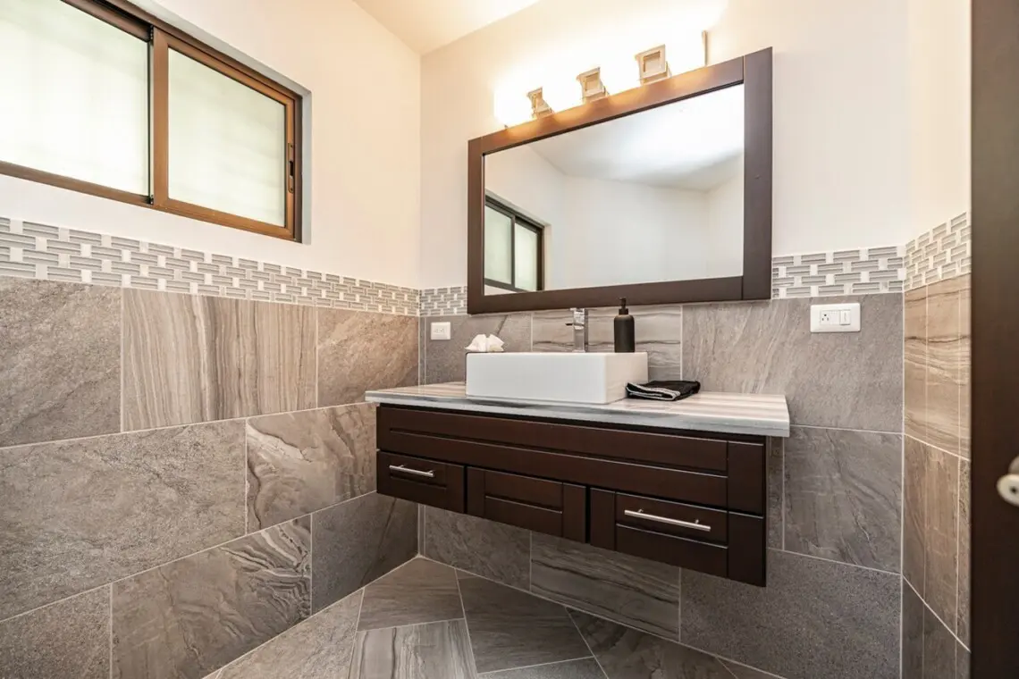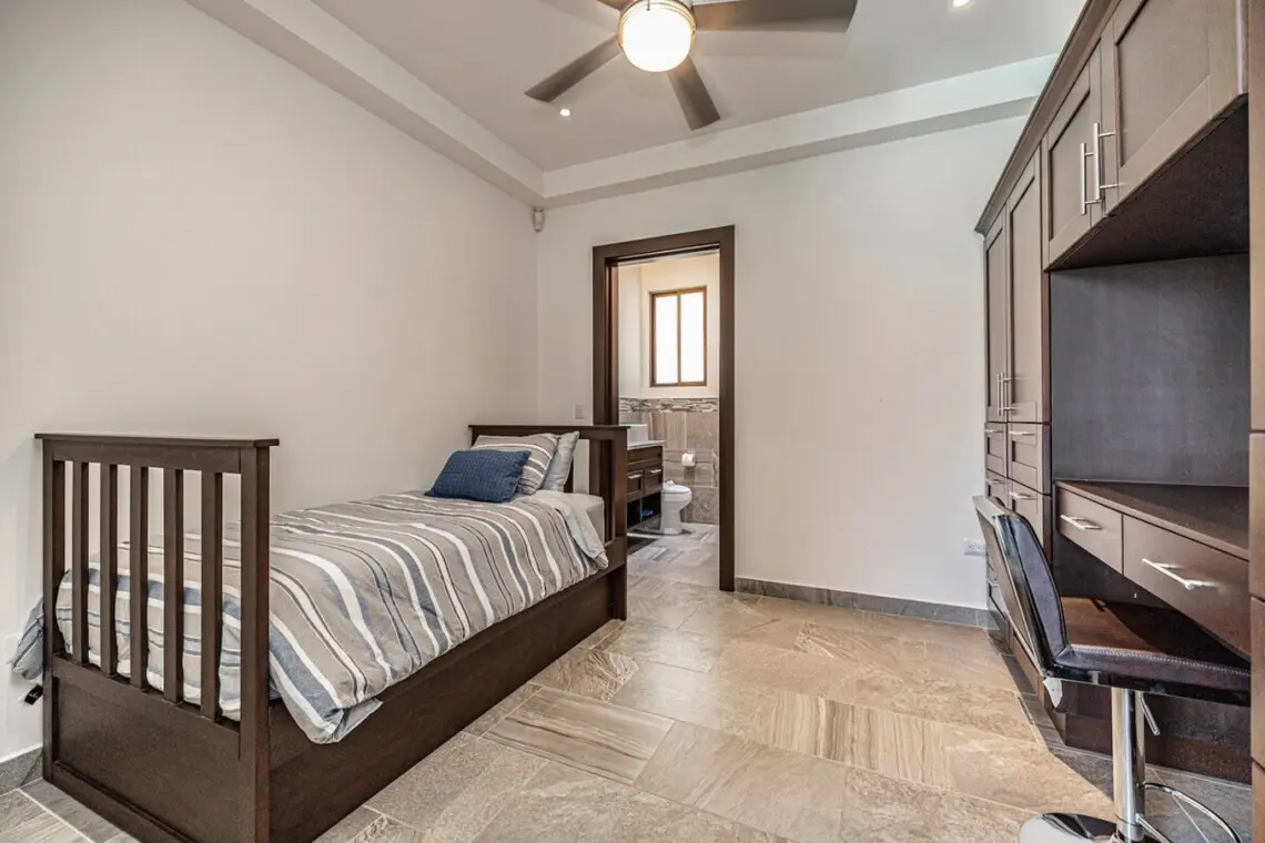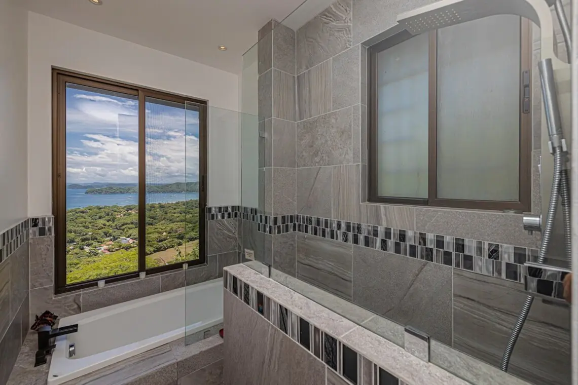 The north wing of the home has 3 bedrooms including the principal bedroom with King bed and large windows that give you beautiful views of the cresecent-shaped bay and even peek-a-boo views of Playa Ocotal. This room has a large closet, ensuite with water closet, vanity with double sinks, large shower stall and an amazing jacuzzi tub with ocean views. There are also 2 additional bedrooms in this wing of the home – the first has a queen bed and the second has a trundle bed (2 singles) plus a dedicated workspace. These bedrooms each have their own sink and toilet and share jack & jill access to a large shower that sits between them.