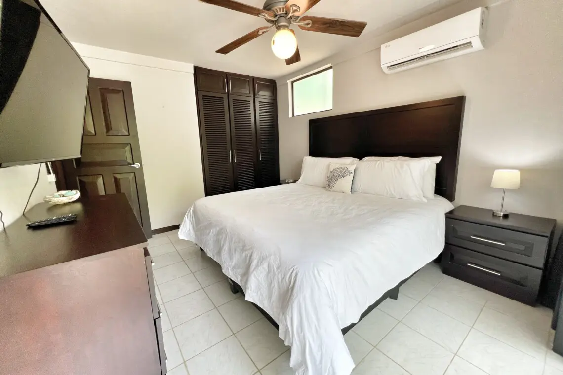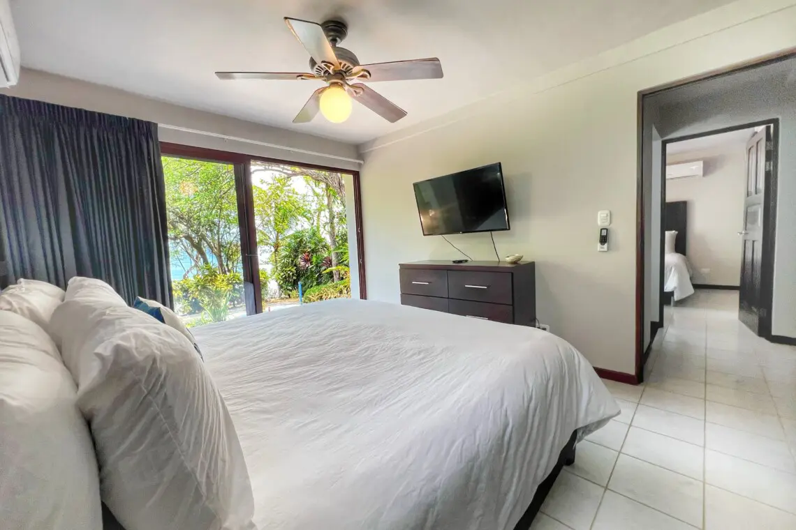 – Primary bedroom – King bed, 42″ Smart TV, dresser, access to ocean view patio. This bedroom has a full bathroom right outside the door.