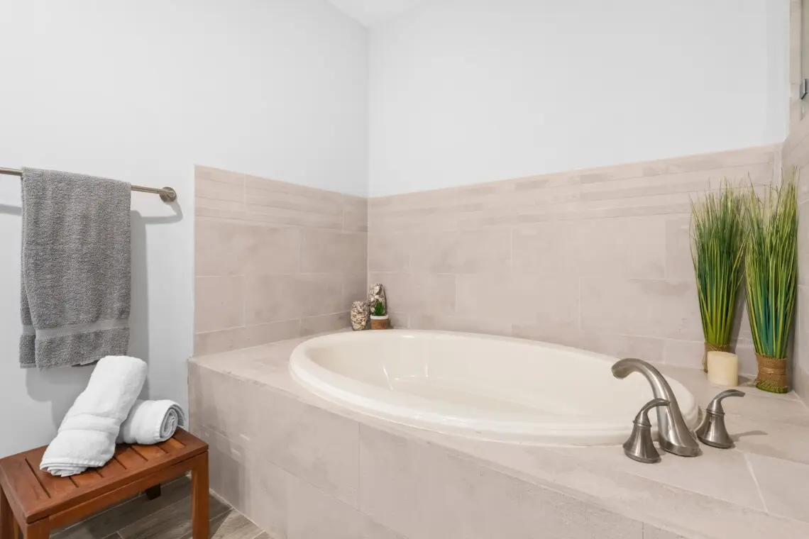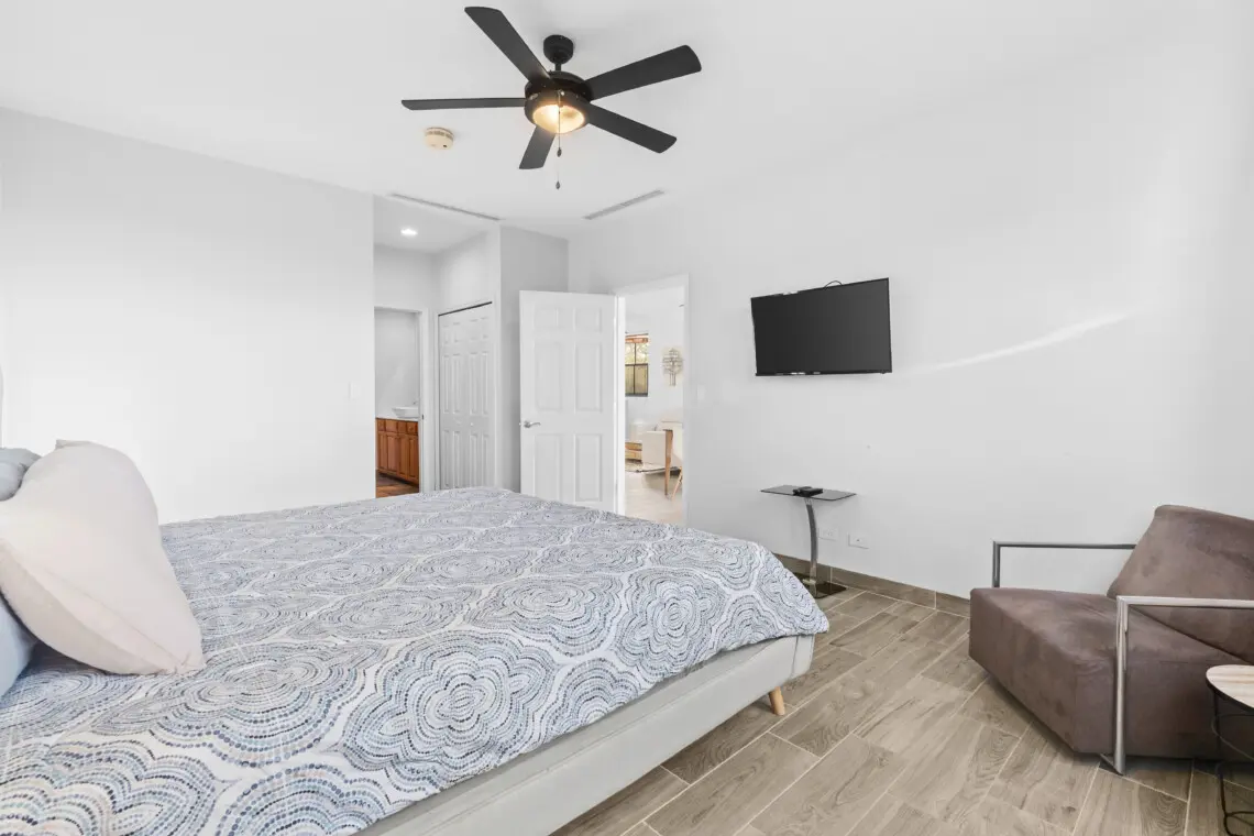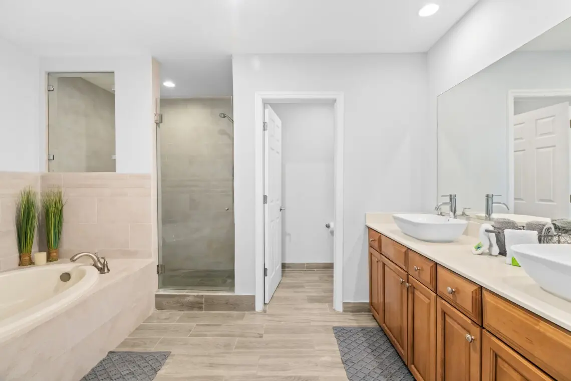 Primary Bedroom – King bed, dresser and walk-in closet, ensuite bathroom with dual vanities and tub.