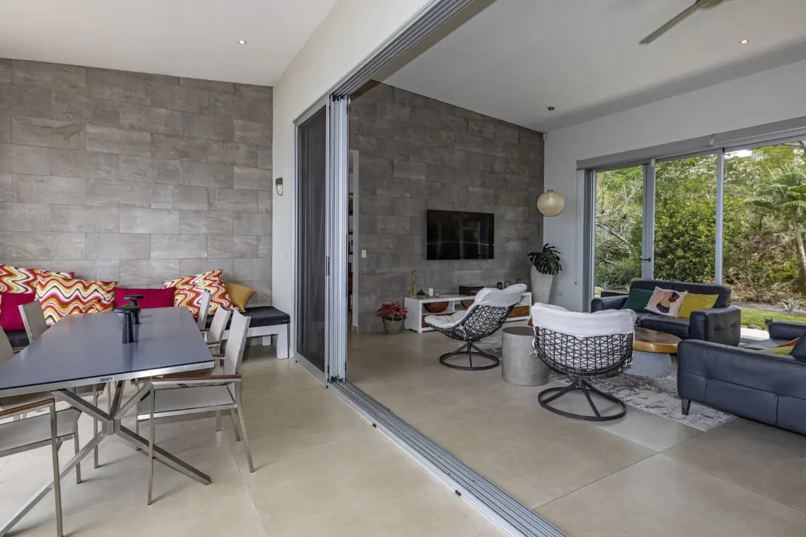 The home’s open-concept kitchen, dining, and living area is perfect for gathering and relaxing. The kitchen features a 5-burner gas stove, wine bar, and breakfast seating for five. Step outside to covered patios with dining for six, lounge chairs, and a shaded seating area—ideal for enjoying ocean breezes from sunrise to sunset. The living room includes a 65″ Smart TV, and those needing telework will love the office nook with a desk and chair. Casa Siete has ample space for families and couples, and offers great privacy with the location of the bedrooms being set on either side of the home.