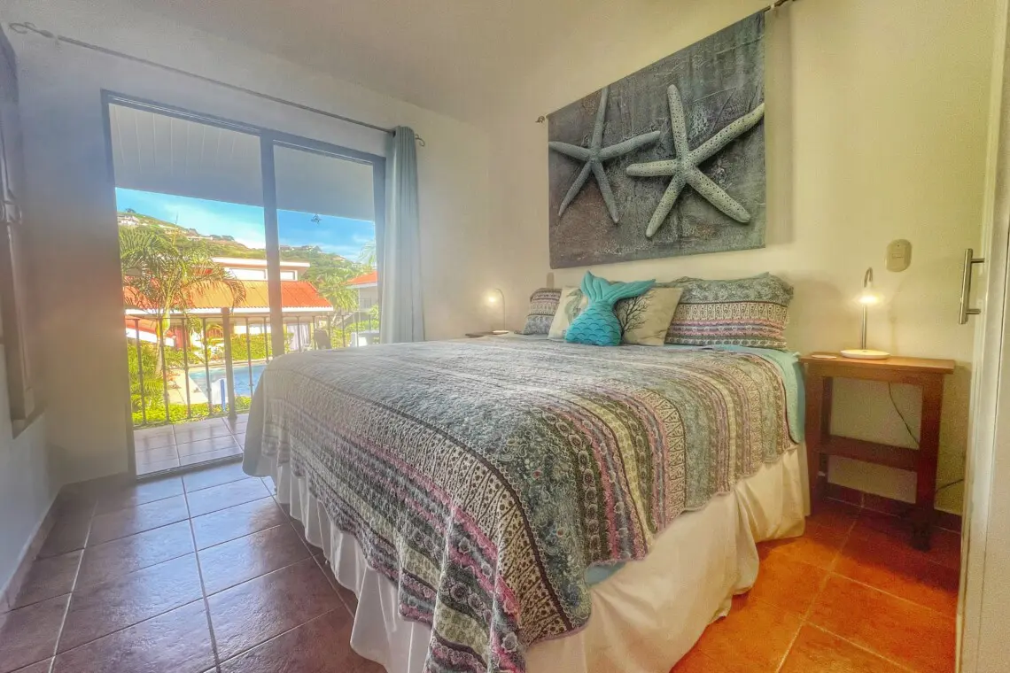 Primary bedroom – King bed, ductless air conditioning, ceiling fan, closet and armoire, safe, private balcony overlooking the pool