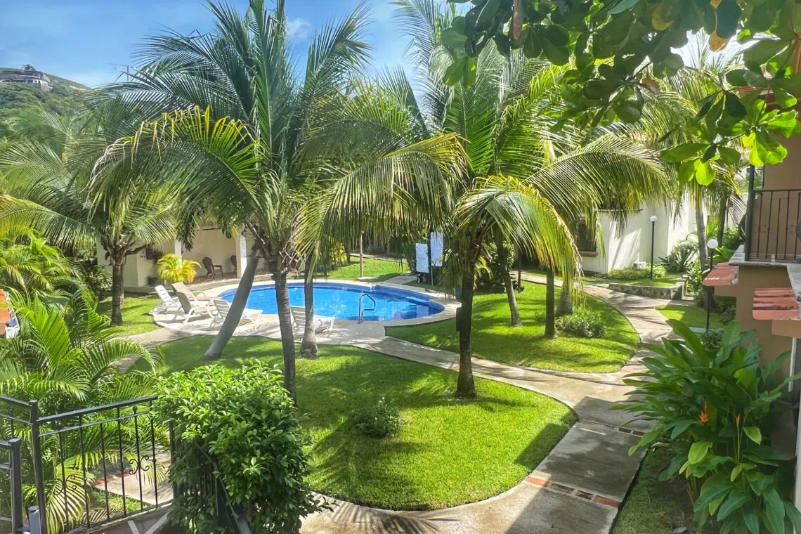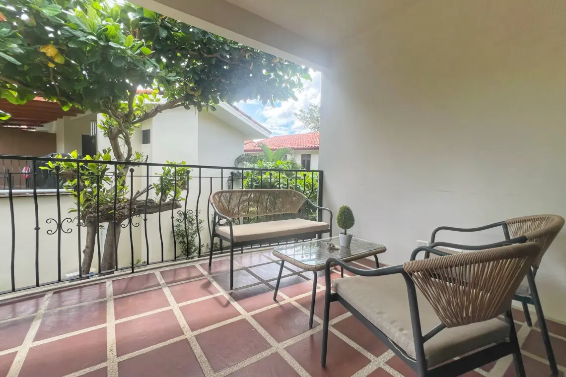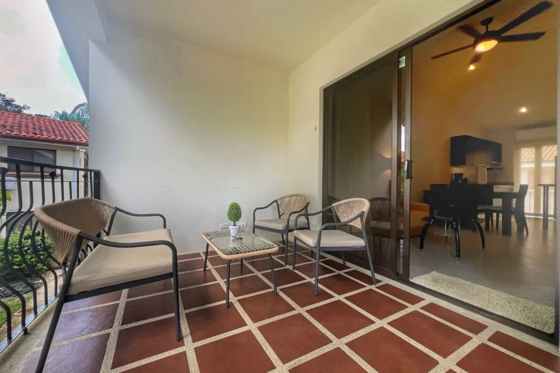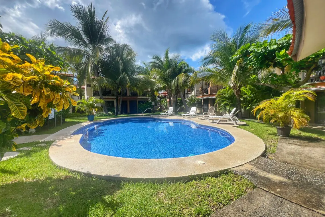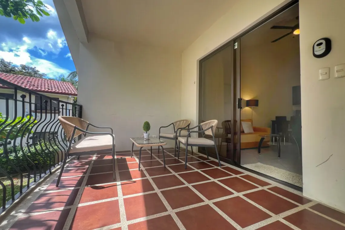 Inside the condo has beautiful, vaulted ceilings throughout, making this one-floor unit seem even larger than the ample square footage. A fully equipped kitchen, living room with Smart TV and dining table make this a great space for families and couples. Located just 35 minutes from Guanacaste Airport (LIR) and just a 5-minute walk to the beach, the location can’t be beat!