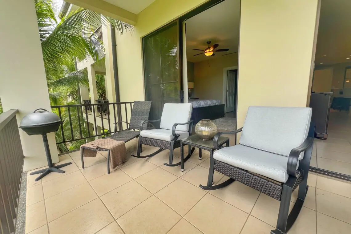– Shaded balcony with lounge chairs and electric grill
