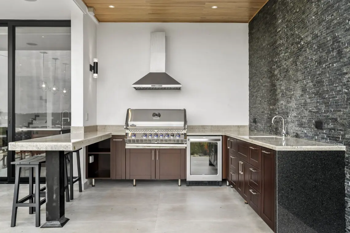 Step outside to the main floor terrace that spans the length of the home. There is a covered outdoor kitchen with an additional dual-zone bar fridge, a massive professional 42″ Napoleon gas BBQ, and bar seating for 3 plus a dining table for 6. A comfortable lounge area includes a sofa and 2 chairs that sit in the shade under the terrace overhang. Beyond that are 6 lounge chairs, all surrounding the infinity-edge, pool. NEW in June 2024 – a pool heater has been installed for guests’ comfort. The terrace also has an outdoor shower, half bath, and a large grassy area perfect for reading a book or lounging in the afternoon sun.