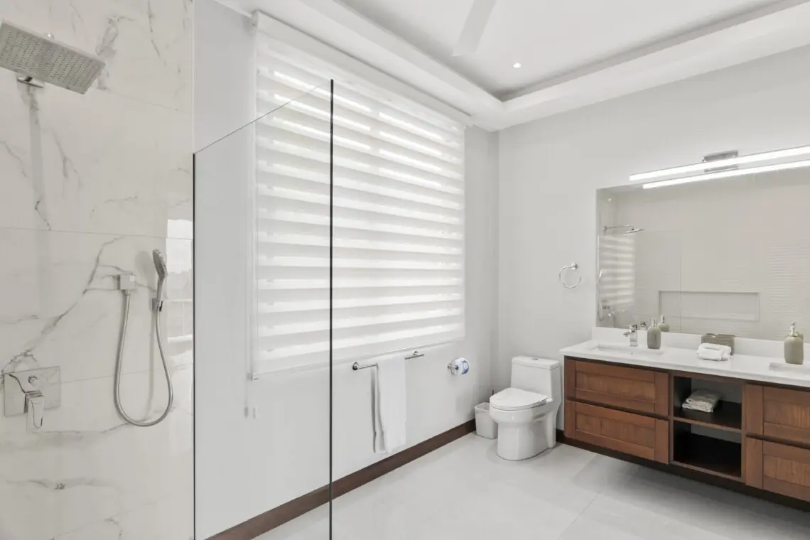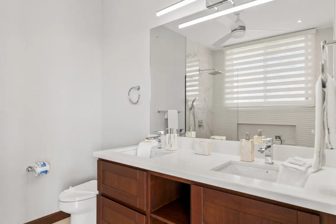 The main floor of the home opens to a wall of windows that overlook the ocean and the surrounding mountains. The living room has a large, comfortable couch and a 65″ Smart TV with doors that open to the covered terrace. The elegant dining space has seating for 8 plus there is a breakfast bar seating for 6 at the kitchen island. The sprawling kitchen has 2 fridges (both a full-size and a dual-zone bar fridge), 48″ commercial grade gas range with 6 burners and grill cook top, dual ovens plus an electrical wall oven, a coffee bar, and is perfectly appointed with small appliances and kitchen amenities. The main floor has a separate laundry room and half bath as well. Just off the living area is the first of 4 bedrooms. This room, the principal bedroom, has a King bed, 43″ Smart TV, Bluetooth speaker system, remote blackout blinds, patio doors that open to the covered terrace, a HUGE closet and large ensuite bathroom featuring double sinks, a stand-up shower, and bathtub with ocean views.