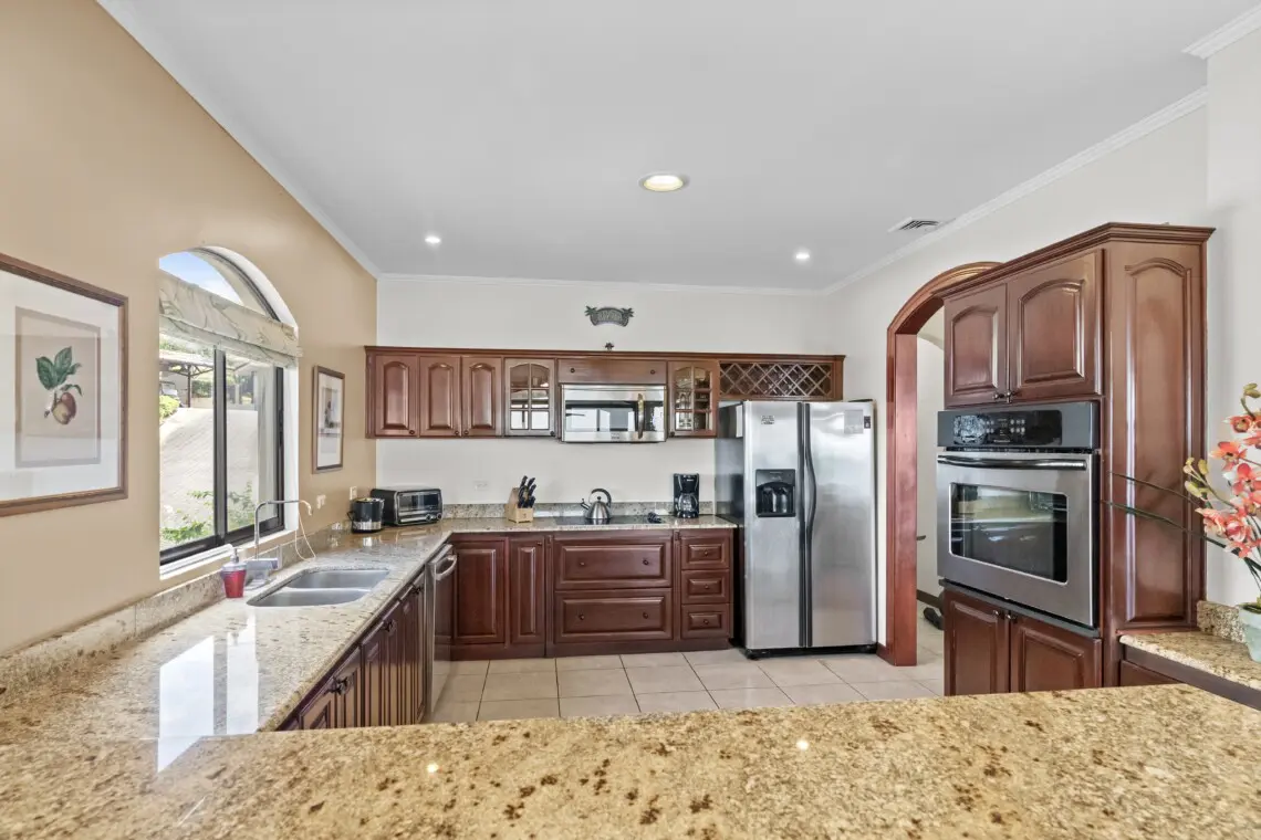 Enter into the open living space featuring a comfortable living room, dining area and gourmet kitchen. The wall of windows and sliding doors gives you an indoor/outdoor feel with beautiful views of the Pacific Ocean. In the kitchen, you’ll cook up some great meals with stainless-steel appliances, wooden cabinets and beautiful granite countertops. Head down the main hallway to one of the three bedrooms, each with plush beds, large windows and en suite bathrooms.