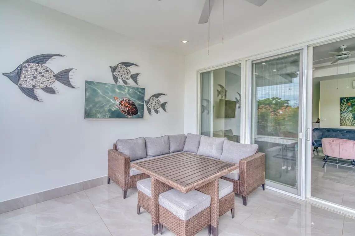 – Large terrace with 52″ Smart TV, outdoor L-shaped sofa, and dining table for 6