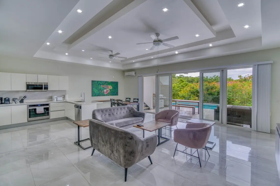 The home’s main floor has a large open living, dining, and kitchen space that opens to the covered pool terrace. Host a games night, stream your favorite shows on the 65″ living room TV, or lounge poolside in your own tropical paradise. The pool area has a gas BBQ, dining area, and pool loungers. The three King bedrooms are nicely separated, offering peace and privacy for your stay.