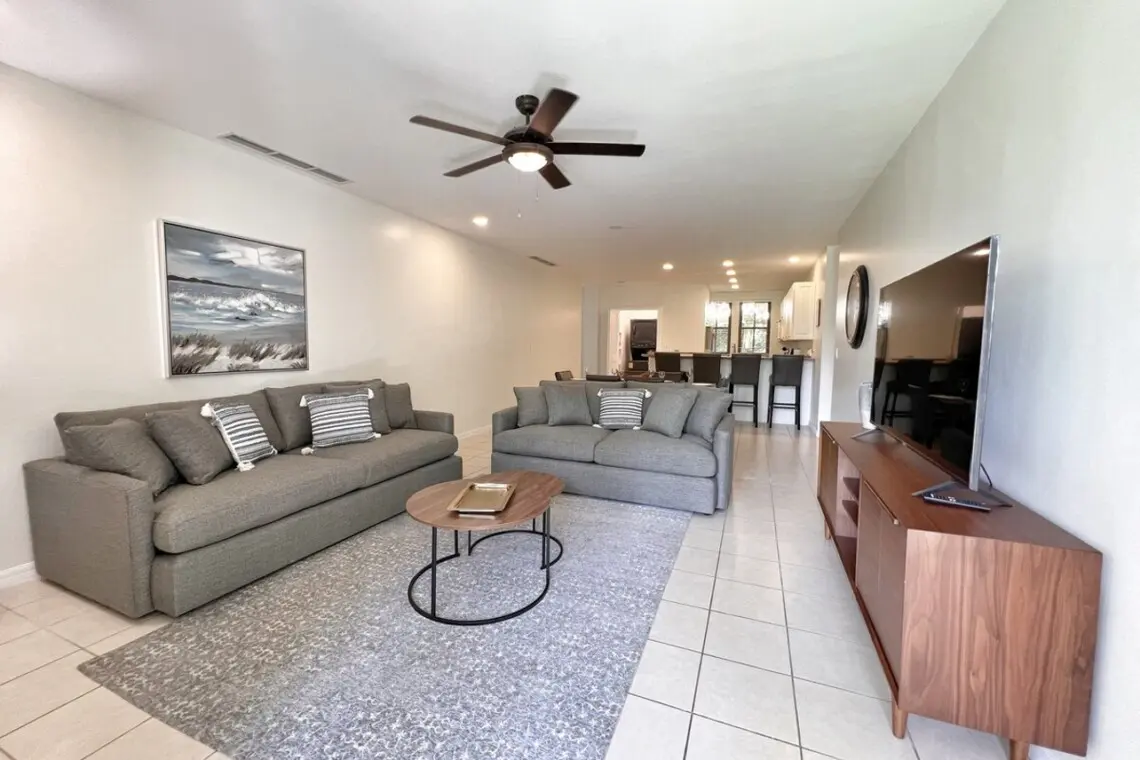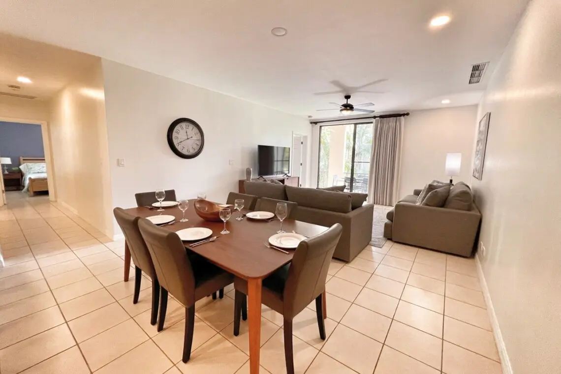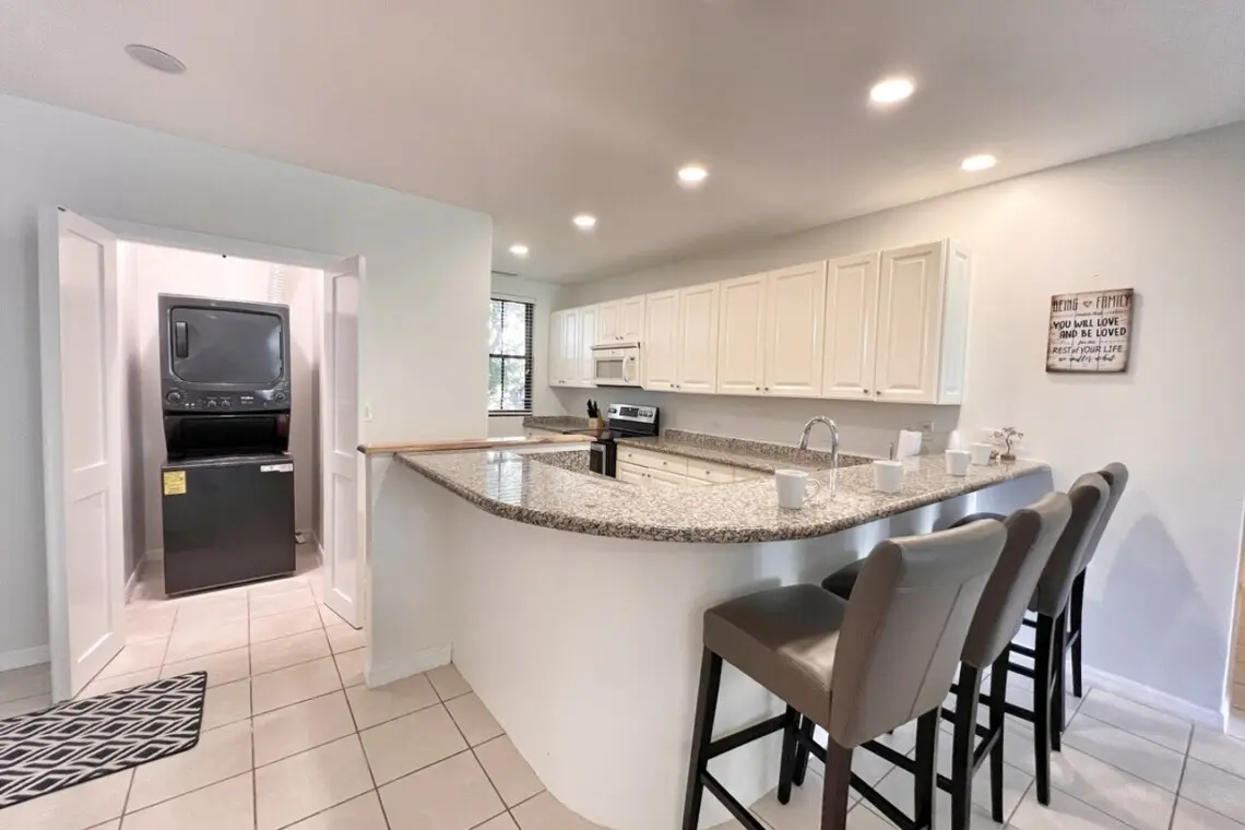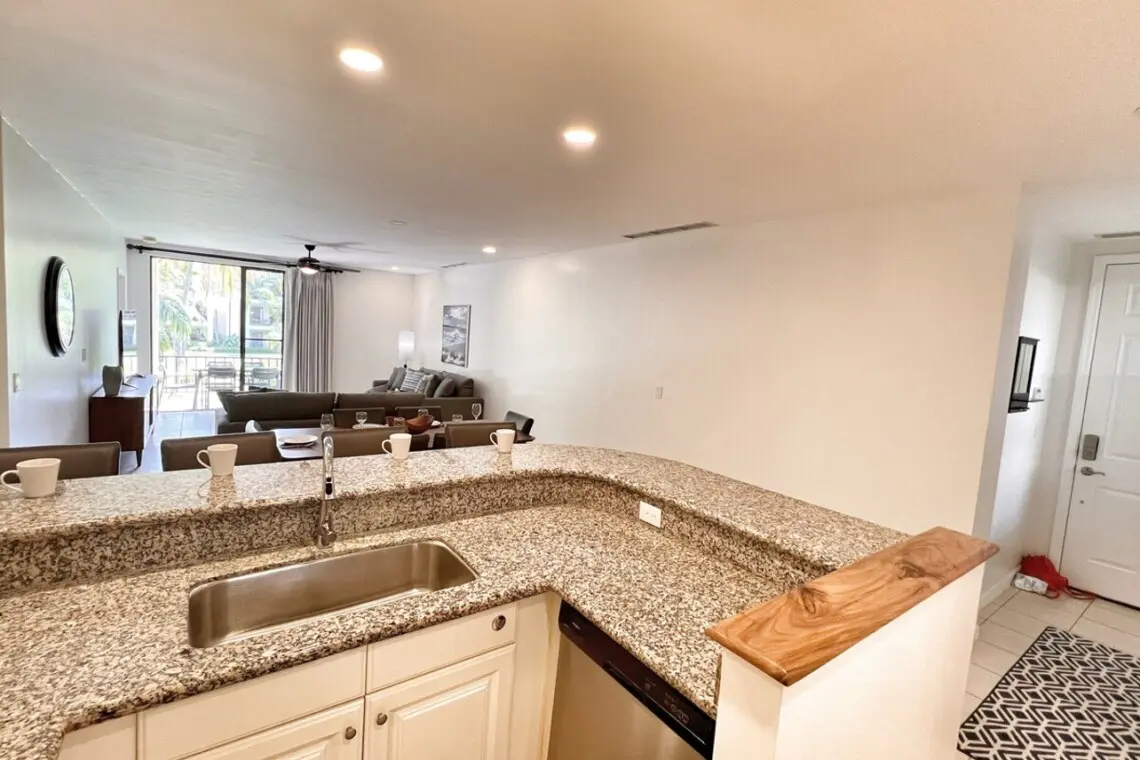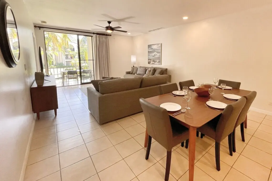 The condo opens to a large, well-equipped kitchen with full-size appliances and breakfast bar seating for 4. There is a stacked washer/dryer in a large laundry closet tucked just off the kitchen. You can also serve up a meal in the dining area, with seating for 6. The dining space flows into the large living area with a flat-screen TV, oversized couches, and access to the large covered terrace. The outdoor space has additional dining for 6 and a conversation set, perfect for morning coffee, an evening beverage or a family games night.