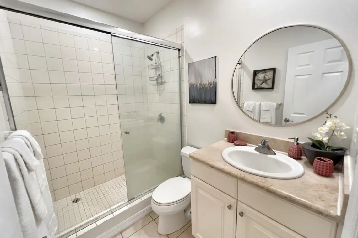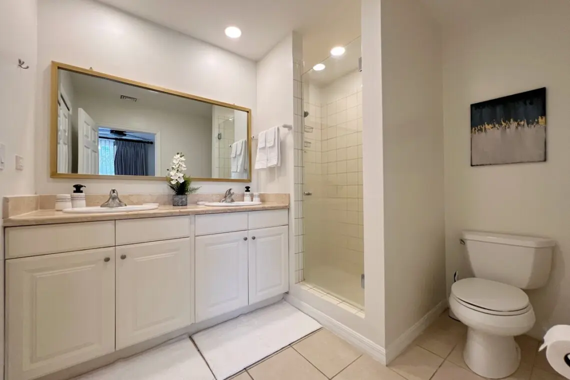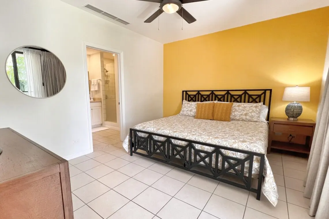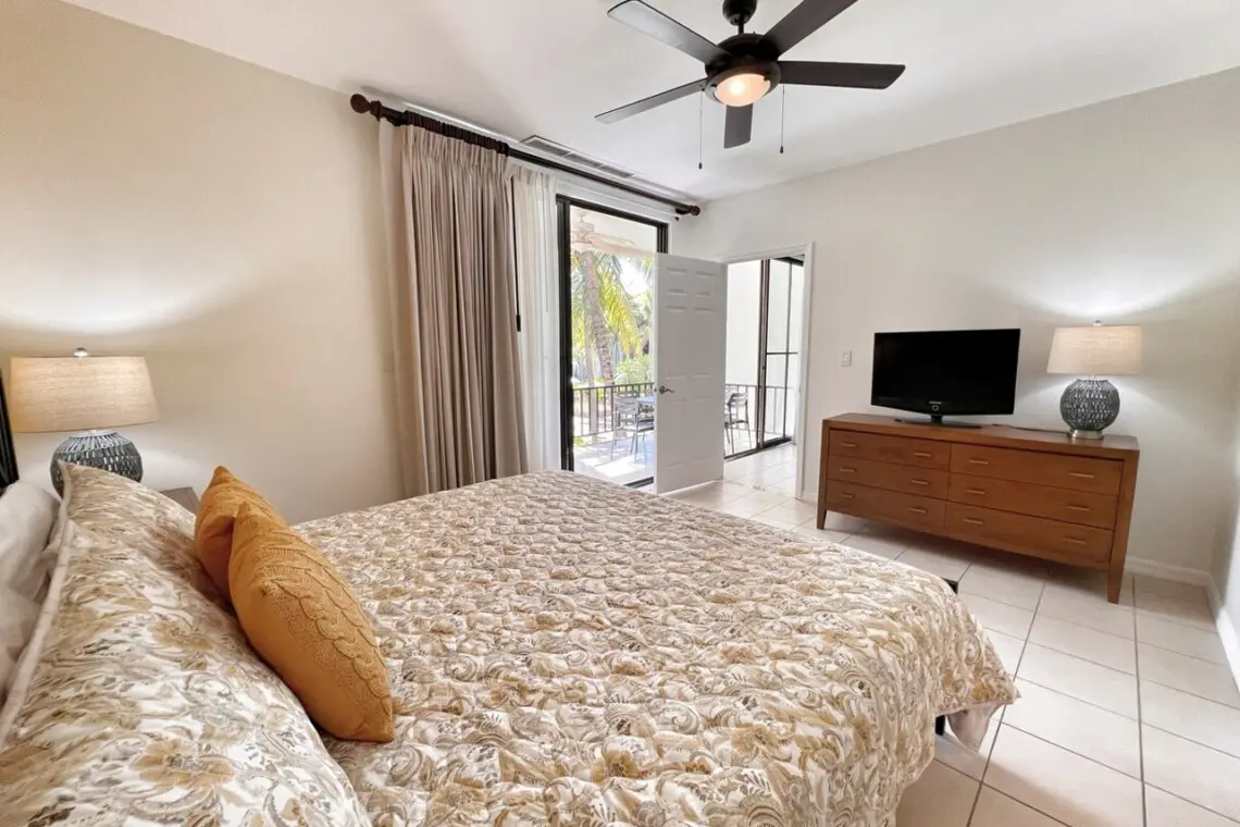 Back inside, the principal bedroom sits just off the living space and also has direct access to the covered terrace. It has beautiful furnishings, a king bed, and a Smart TV. The spacious ensuite bathroom has two sinks, a large shower, and a walk-in closet.