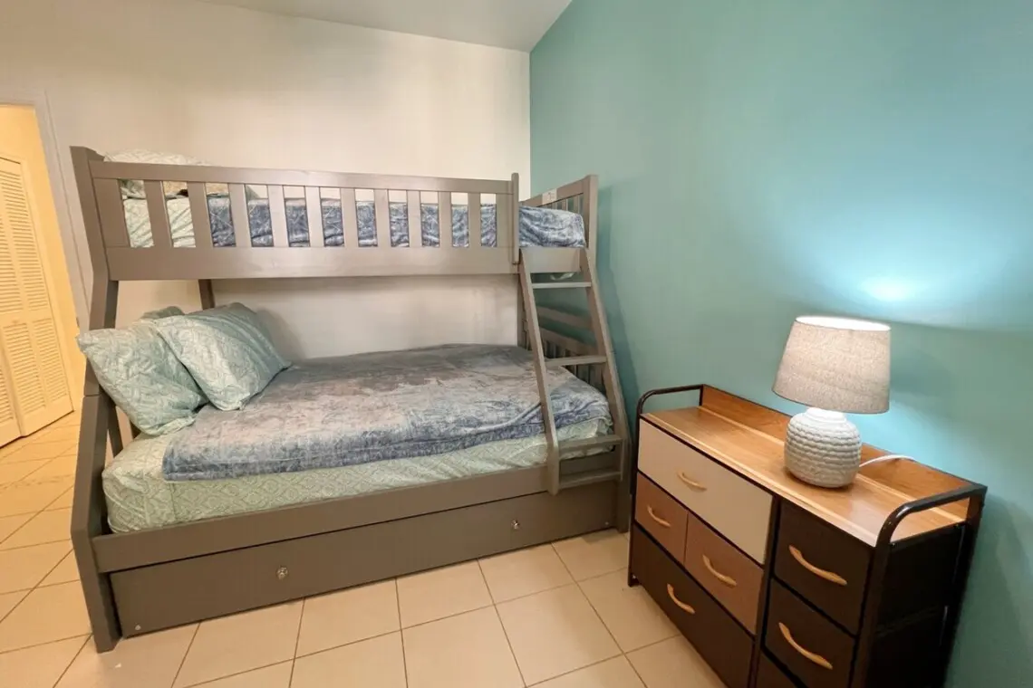 Separated from the principal bedroom, the other 2 bedrooms are accessed down a hallway from the kitchen. The floorplan gives guests peace and privacy with ample space between sleeping quarters. The first bedroom has a king bed and the second has a bunk bed with a double on the bottom and a single on the top. These bedrooms share a 3-piece bathroom with a large shower.