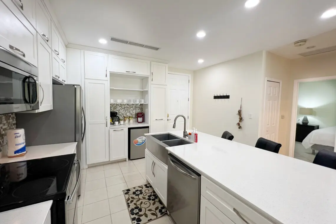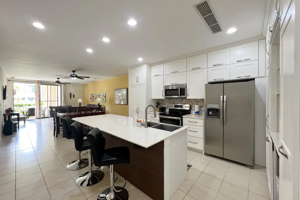Inside, modernity meets functionality in the sleekly updated kitchen, boasting quartz countertops, stainless steel appliances, and a convenient breakfast bar seating three. The interior dining area comfortably accommodates six, perfect for hosting memorable meals or lively game nights. Outside, a charming dining table for four awaits on the terrace, alongside a cozy conversation set, offering an idyllic spot to savor al fresco dining or unwind with a sunset cocktail.