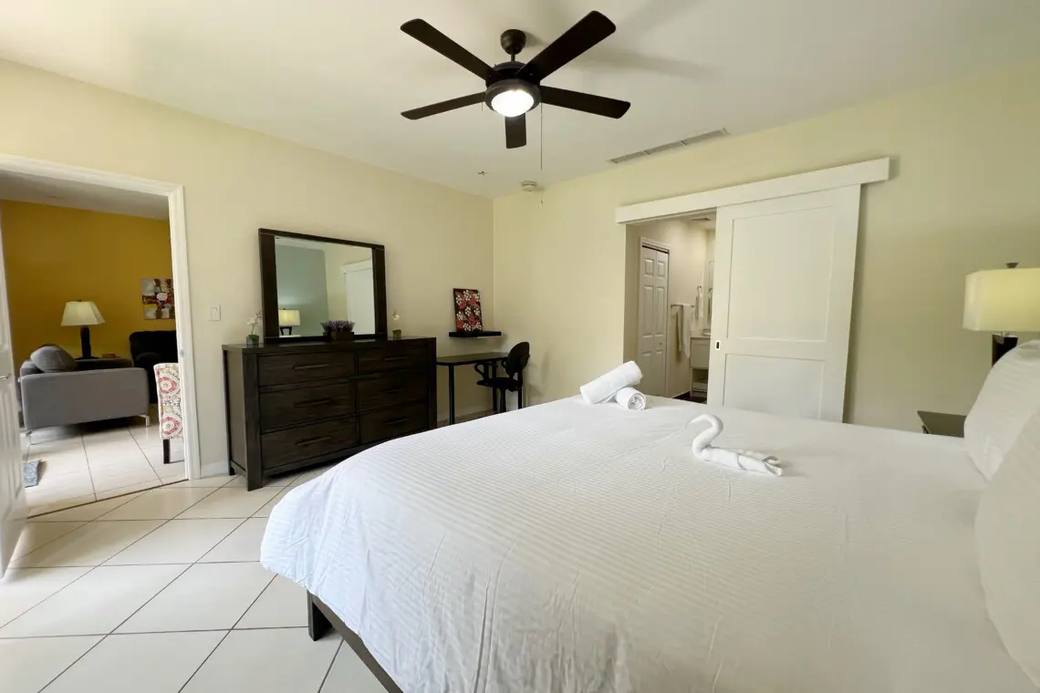 Primary Bedroom – King Bed, workstation & chair, walk-in closet, ensuite bathroom with double vanities