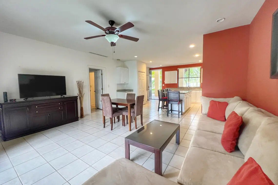 The large kitchen and living space are ideal for relaxing or entertaining, with a smart TV for streaming your favorite shows. Step out onto the covered terrace, where you can enjoy morning coffee or an evening drink before walking out directly to the pool for a refreshing swim. The bedroom features a luxurious king-sized bed and its own smart TV, ensuring your stay feels like a home away from home.