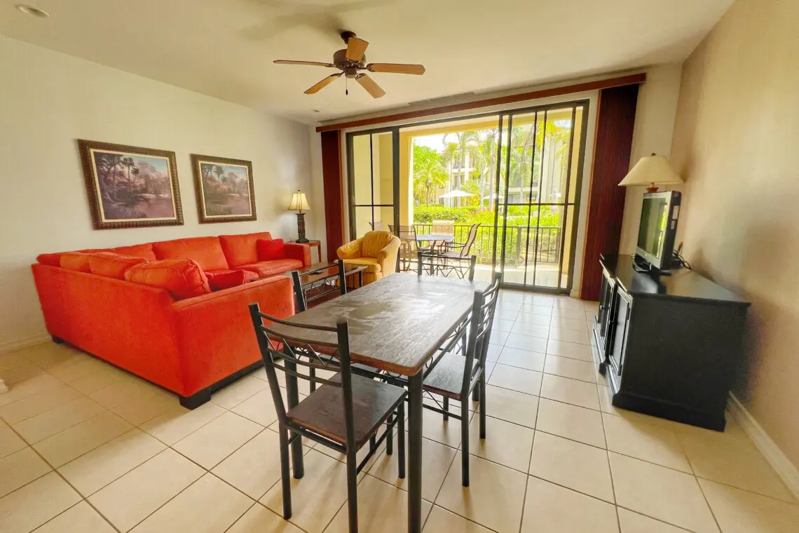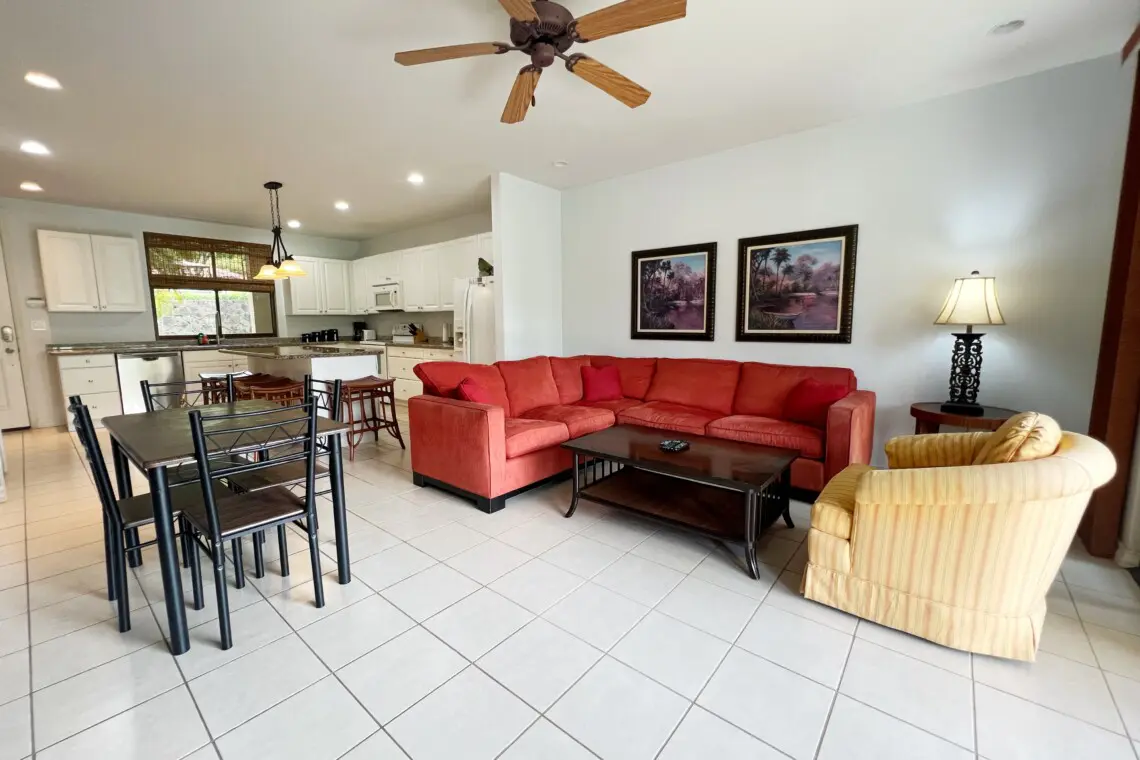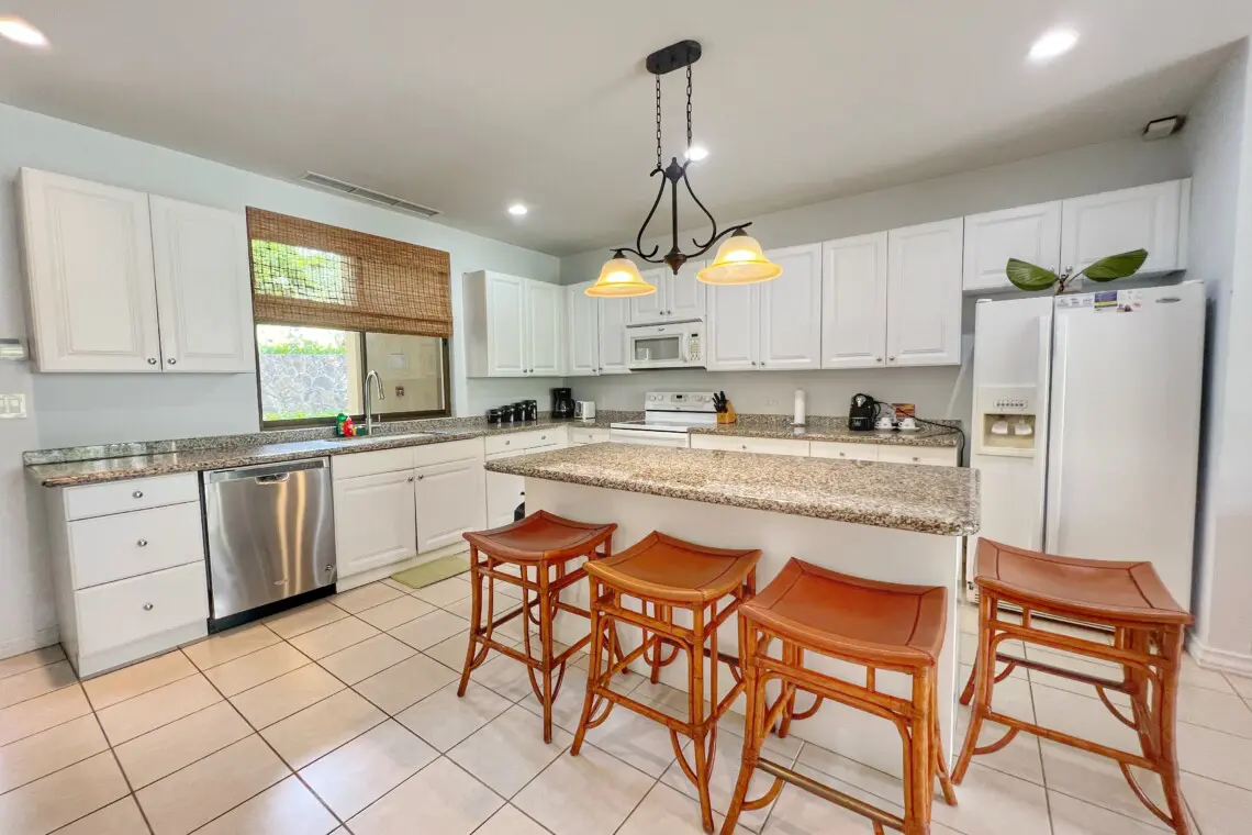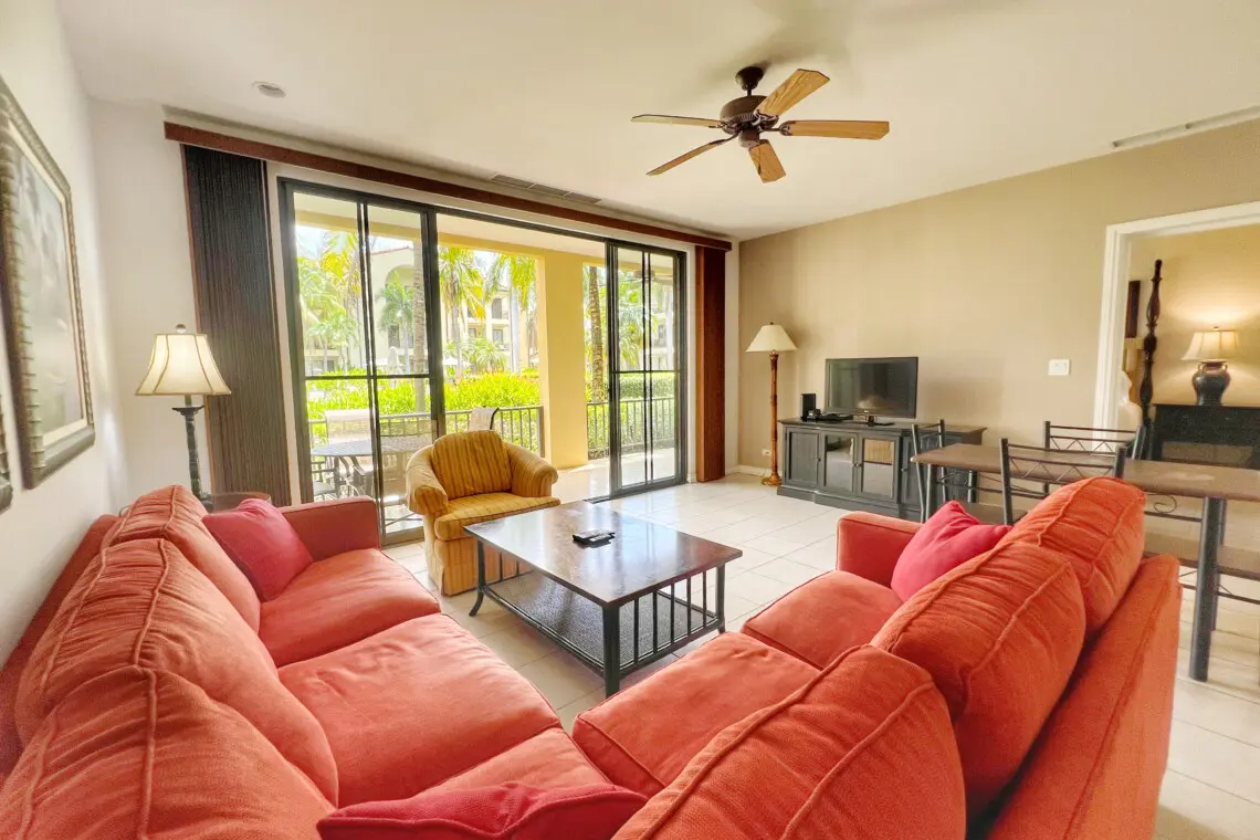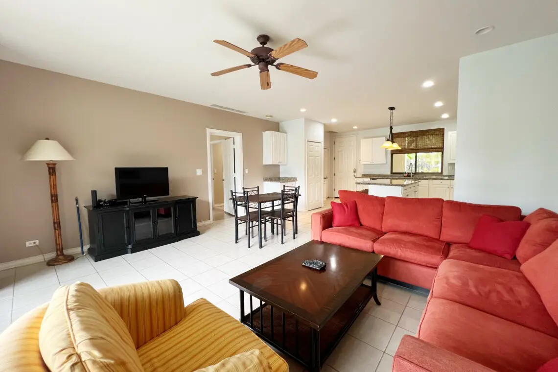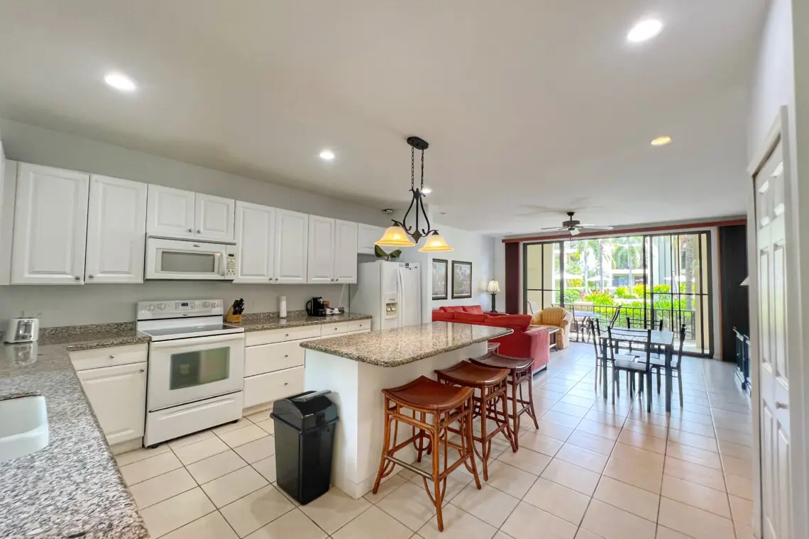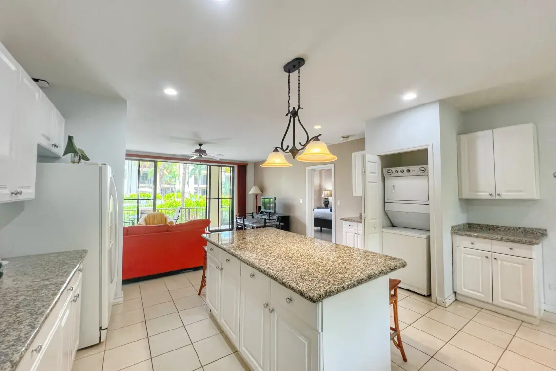 This beautifully furnished condo is the perfect spot for a memorable vacation. The large kitchen is equipped with full-sized appliances and granite countertops. The spacious living room has a beautiful sectional sofa with sofa bed and a flat-screen TV.