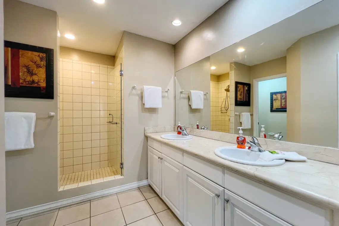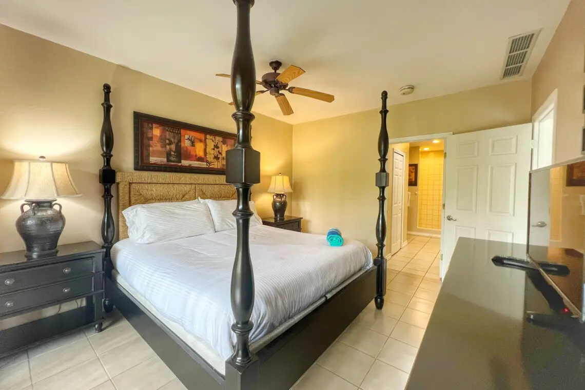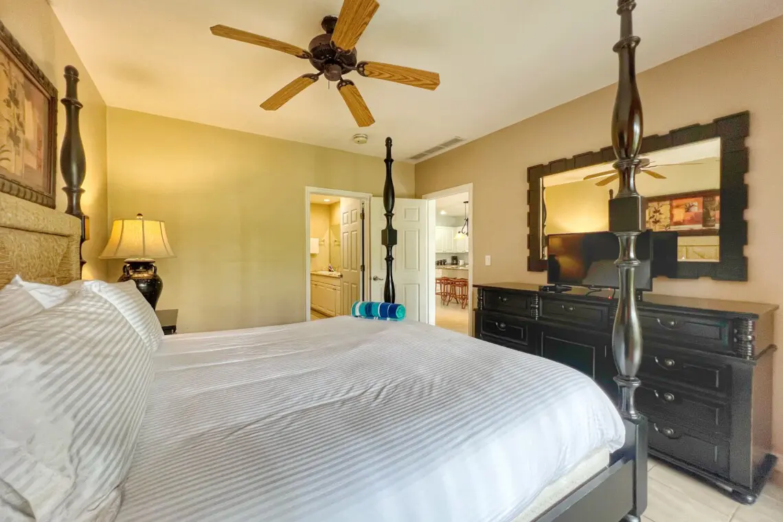 The master bedroom boasts an amazing 4-poster king bed with high end bedding. Through the bedroom you will find the large en-suite bathroom with double vanities, and a large walk-in closet. The bedroom also has access to the large, covered patio.