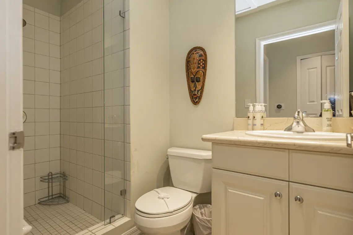 Primary Bedroom – King bed with terrace access, ensuite bathroom with double vanity, shower stall, water closet, and large walk-in closet