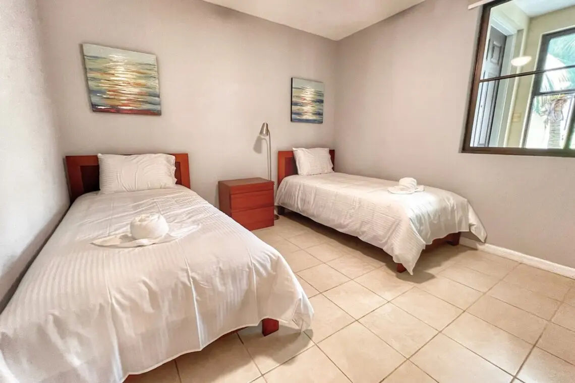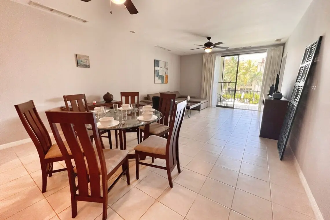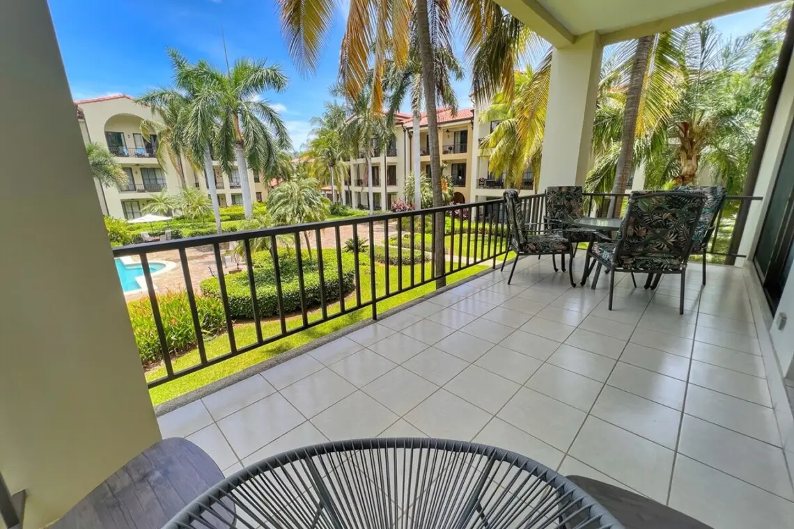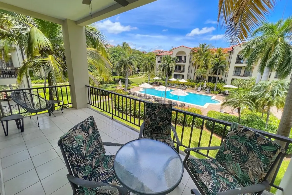 This condo was refreshed in August 2023 with new paint, new linens, new furniture upholstery and updated finishes. This second floor, 2 bedroom, 2 bath condo overlooks the quieter pool and has 2 KING bedrooms (one can be configured as 2 single beds, plus a full kitchen, in-unit laundry, a large living room and a covered terrace that stays shaded throughout the day. The location is a quick walk to the on-site restaurants, main a large grocery store and Coco’s bustling main street! Guests enjoy access to several on-site pools, the oceanfront PACIFICO Beach Club, walking/hiking trails and a kids park.