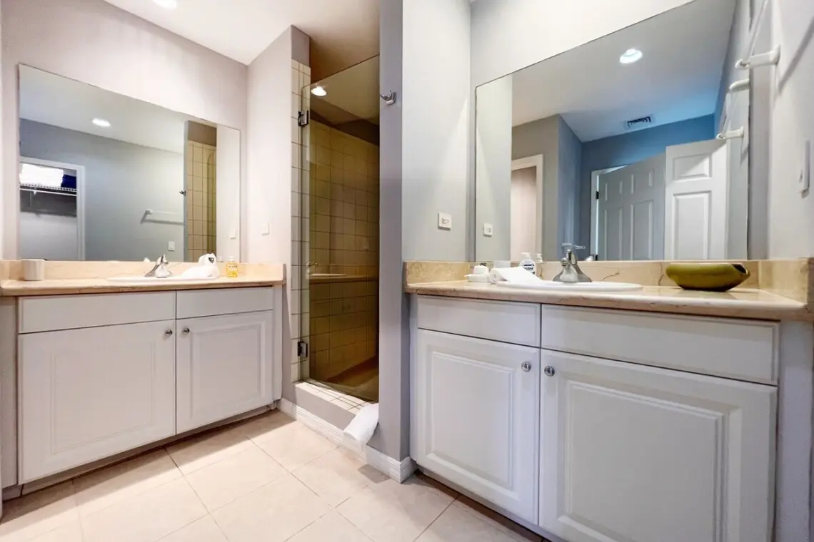 Primary Bedroom – King bed with terrace access, en-suite bathroom with double vanity, shower stall, water closet, and large walk-in closet