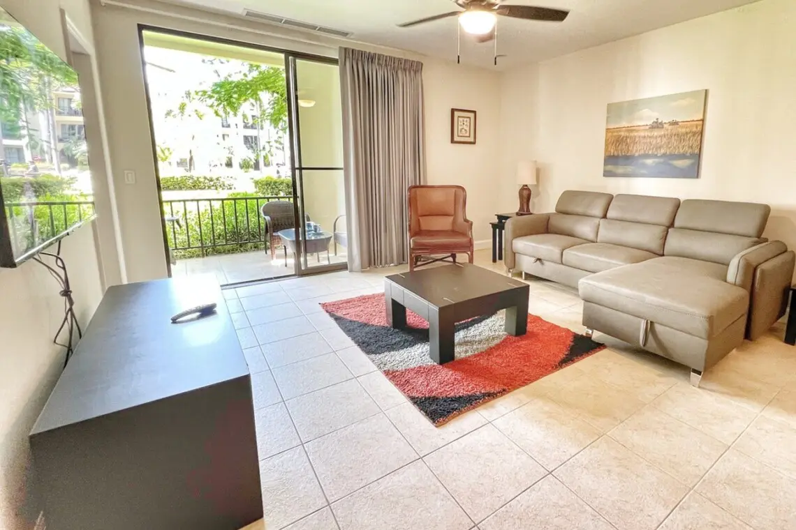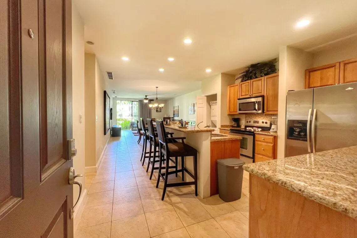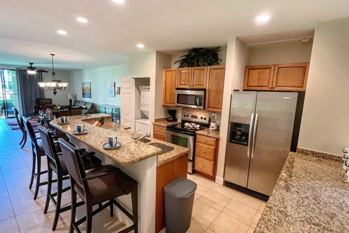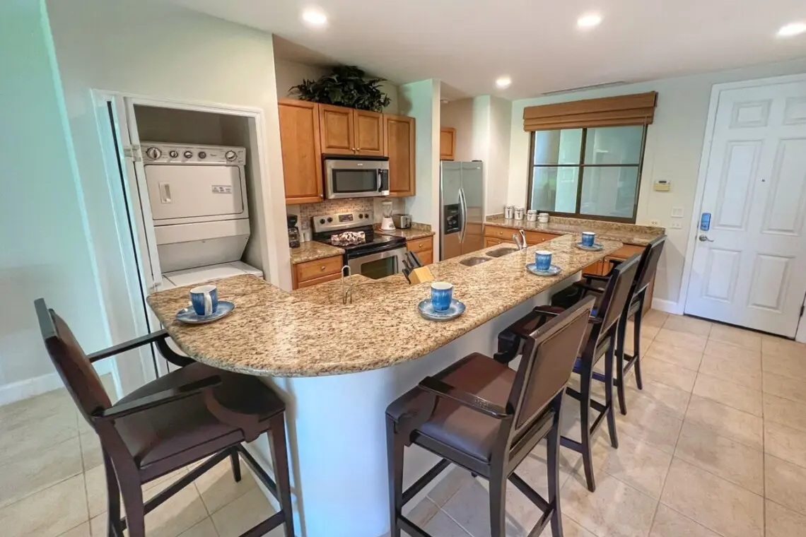 The unit has a spacious kitchen with breakfast bar with seating for four and a stacked washer/dryer tucked at the end of the space. Beyond the kitchen is a dining table for four and a comfortable new sofa (July 2022) that doubles as an additional sleeping space, plus a flat-screen Smart TV for streaming your favorite shows. The living room has floor-to-ceiling windows and sliding doors that open to your private, covered terrace.