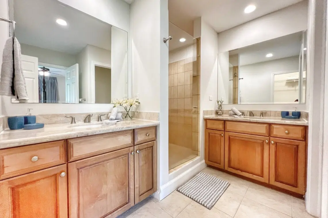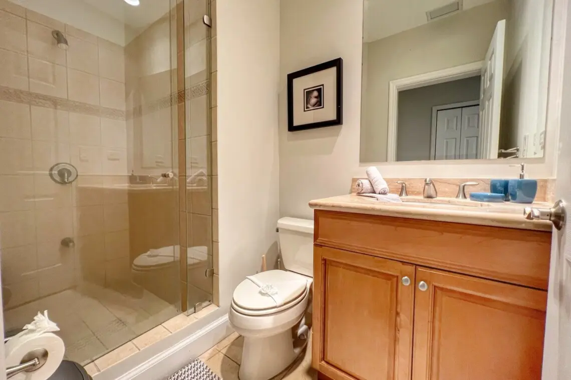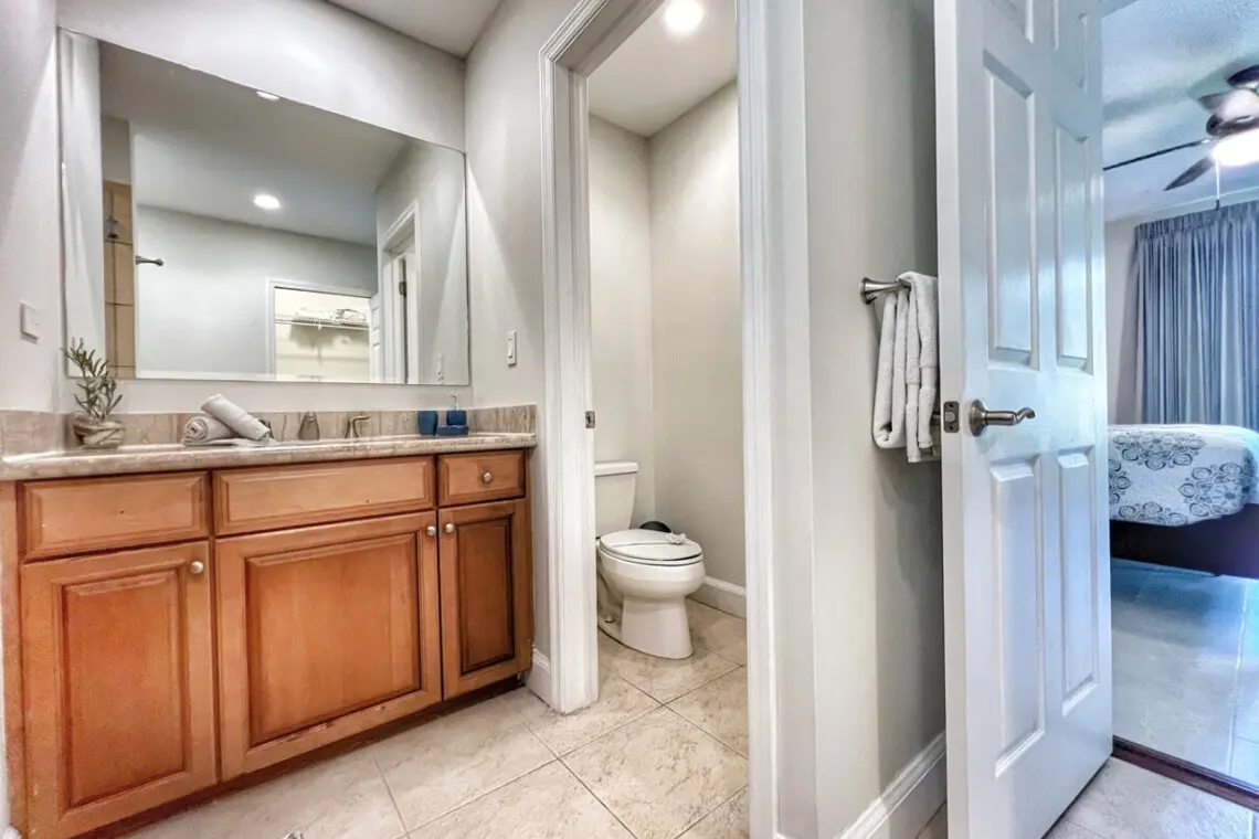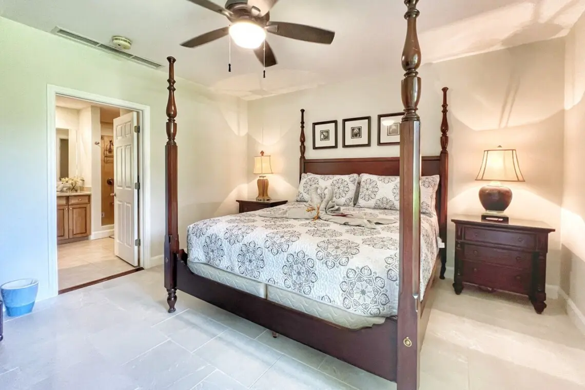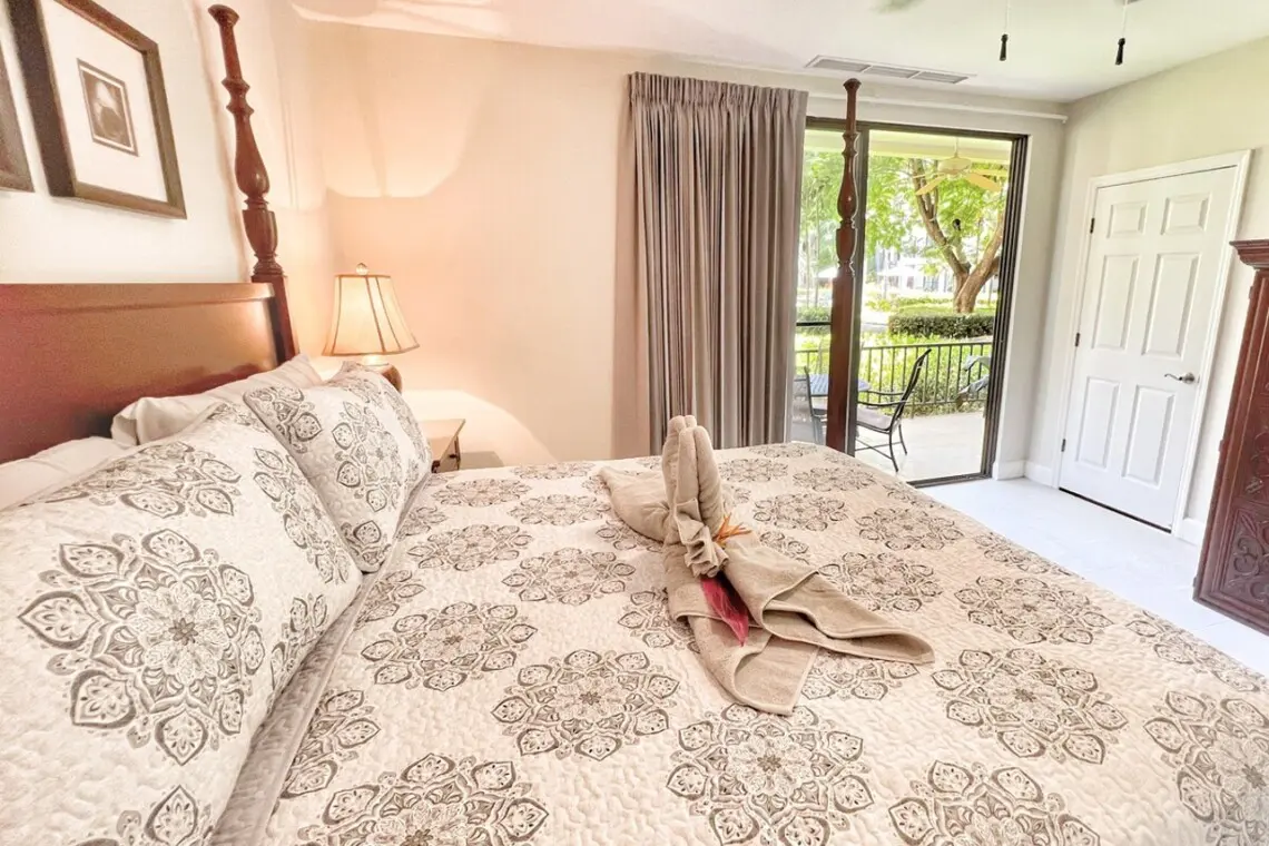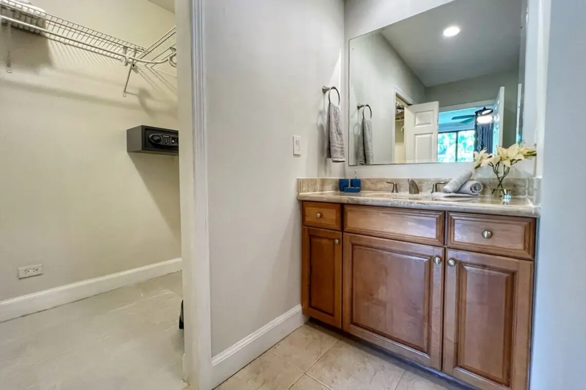 Just off the kitchen are a full bathroom and the first bedroom, with a queen bed and a large closet. The principal bedroom sits off of the living room and has a beautiful 4-post king bed and TV with Amazon Firestick. There is a large en-suite bathroom with double vanities, a shower stall, a separate water closet, and a large walk-in closet with a safe. The bedroom also has access to the terrace through sliding doors.