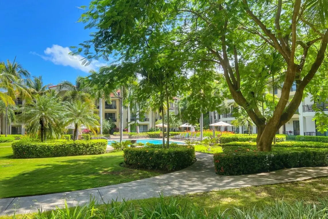 PACIFICO L1302 is a ground-floor condo with a spacious terrace and views of one of several pools in the development. The location of this condo is amazing! Set just inside the main gate of the development, you have quick access to town via both the vehicle and pedestrian gates. You also are just steps from a beautiful pool, surrounded by palm trees and tropical flowers, but set back from the pool so that you can enjoy your shaded patio with peace and privacy.