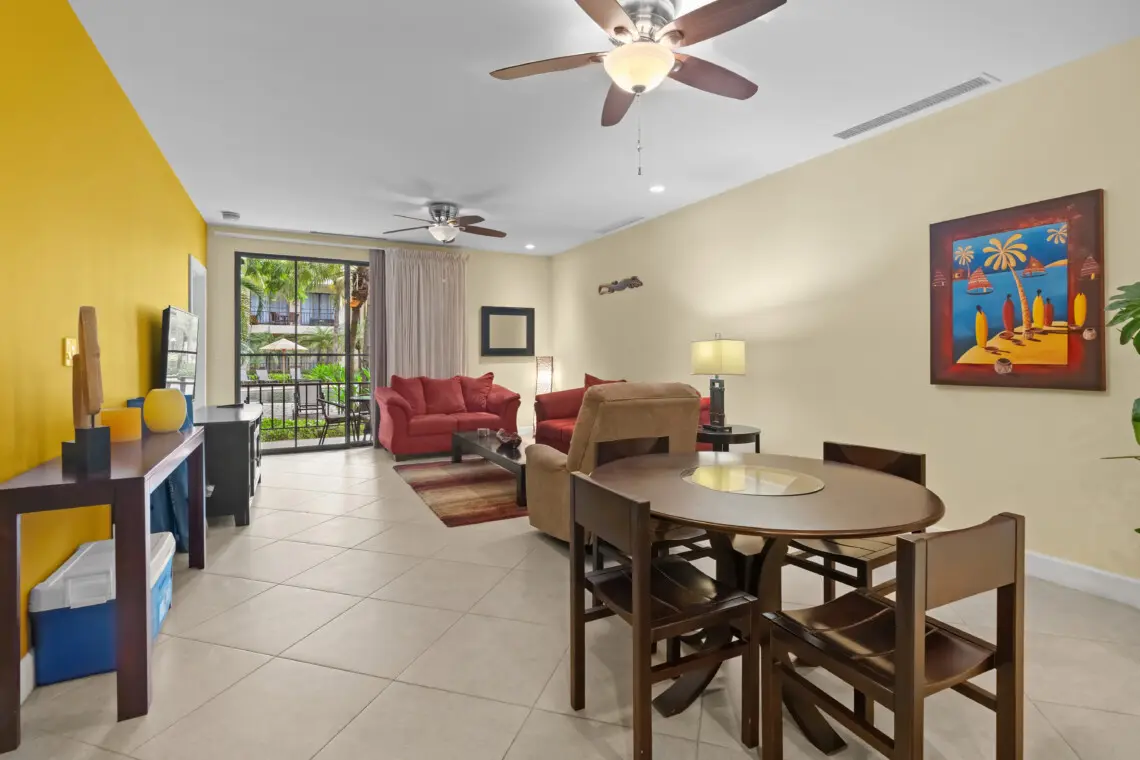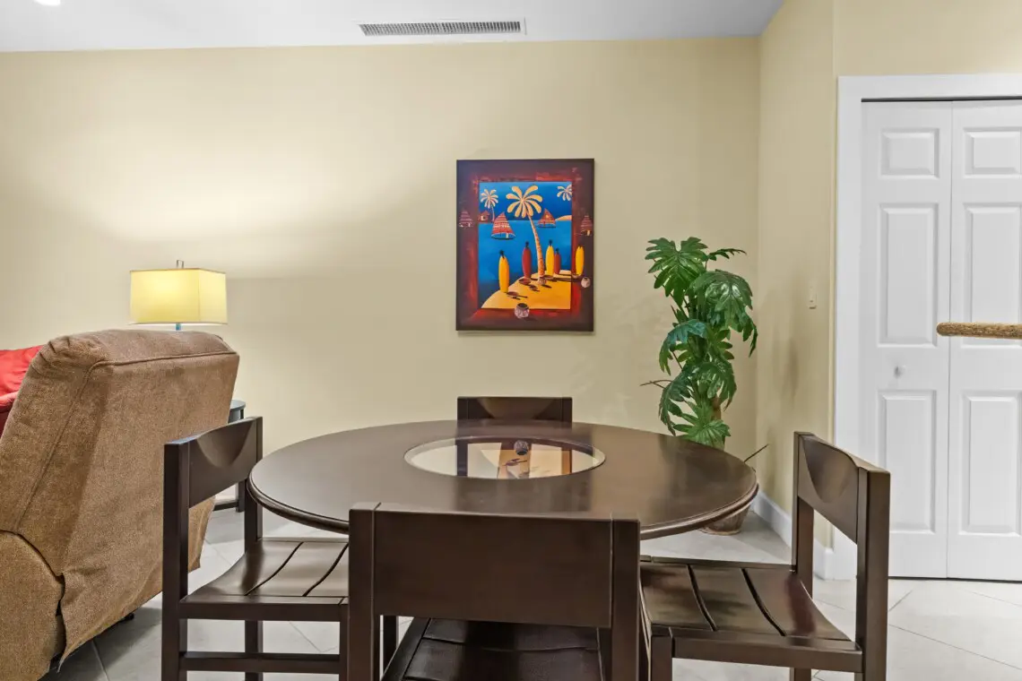 The rental is designed with a fully equipped kitchen, complete with a breakfast bar that seats three and full-size appliances, including a stacked washer and dryer for added convenience. The dining area comfortably accommodates four guests, perfect for enjoying meals together. The living room is a cozy space with a smart TV, providing entertainment for relaxing evenings. Surrounded by tropical grounds, the property offers a serene ambiance, enhanced by the proximity to the Piña Shack poolside bar and grill.