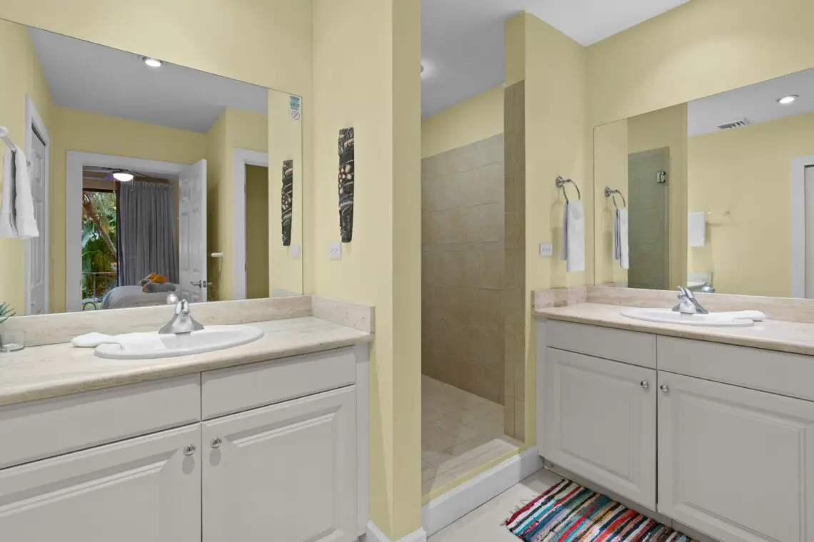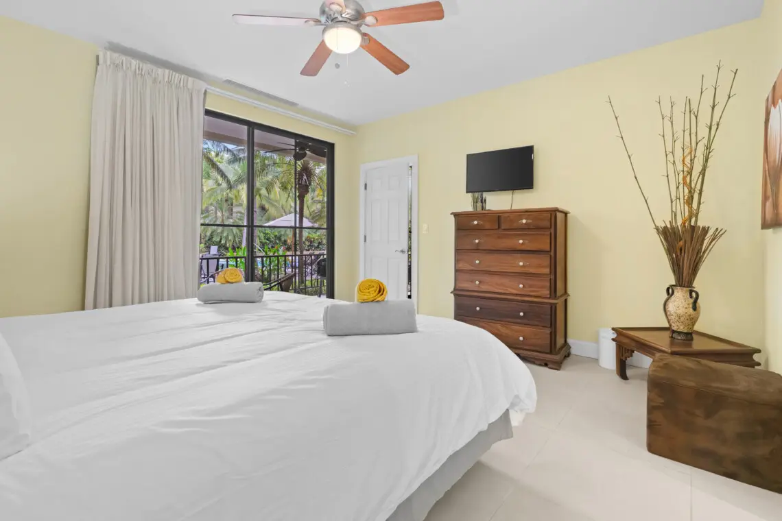 The unit features two well-appointed bedrooms and two full bathrooms, providing ample privacy and comfort for guests. The first bedroom, situated at the front of the unit, includes a king bed that can be converted into two twin beds upon request, making it ideal for flexible sleeping arrangements. The primary bedroom boasts a comfortable king bed and has direct access to the covered terrace, offering a peaceful retreat. Two full bathrooms