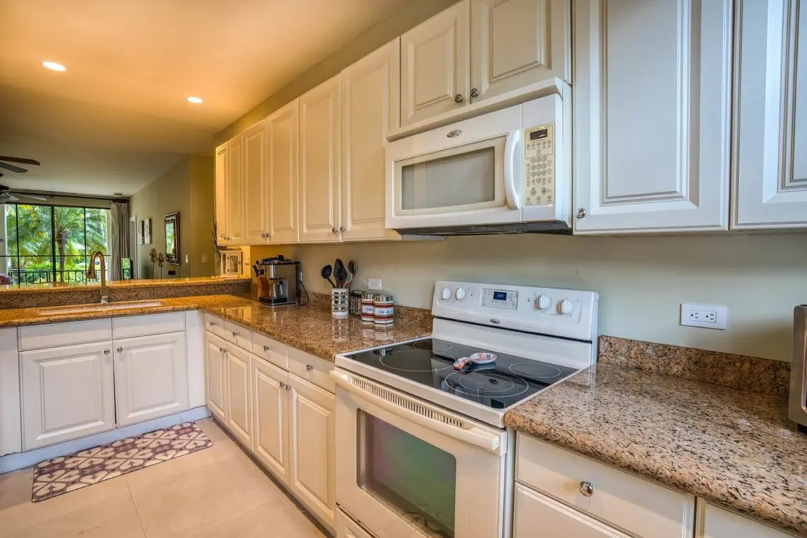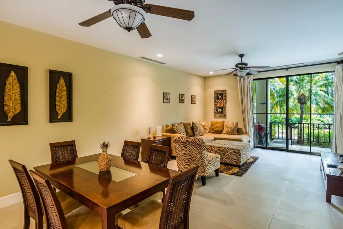 Enter into the large kitchen with island seating for 6 and all of the amenities of home. There is even a stacked washer/dryer for your convenience. The kitchen flows to the dining area with seating for 6 and a comfortable living room that opens to a large covered terrace surrounded by palm trees and tropical foliage. The terrace area has a 4-person dining table as well as an electric grill. The terrace overlooks walks out to the pool but is set back from it for peace and privacy.