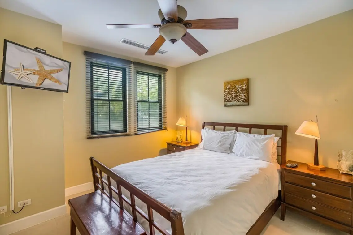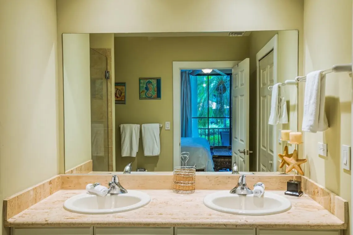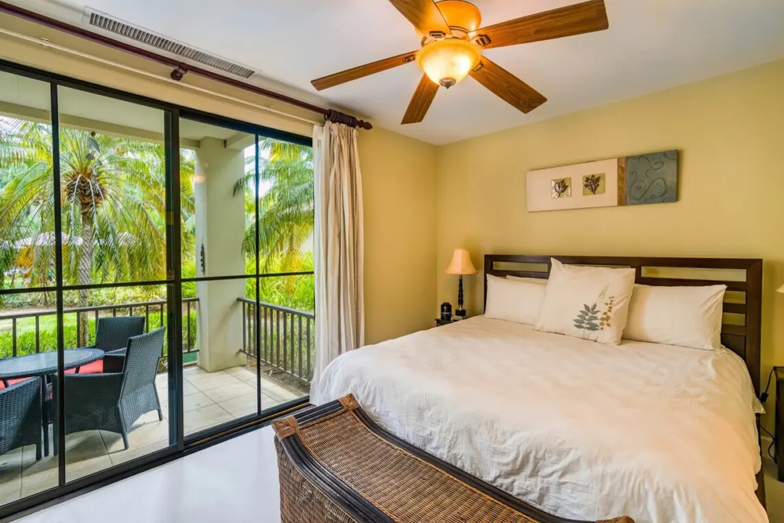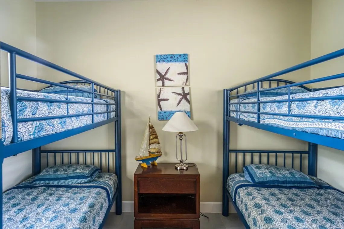 Off of the living area is the primary bedroom with a king bed, rich wood furniture, and an ensuite bathroom with a shower stall and double sinks. This bedroom has patio doors that open to the covered terrace. Back inside, the second and third bedroom sit off the kitchen. The second bedroom has 2 bunk beds and the third bedroom has a queen bed. Just outside these bedrooms is the second full bathroom. The unit has central air and 100MB internet throughout.