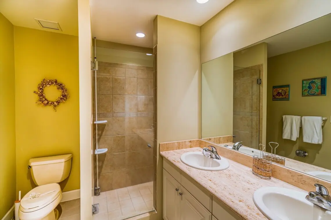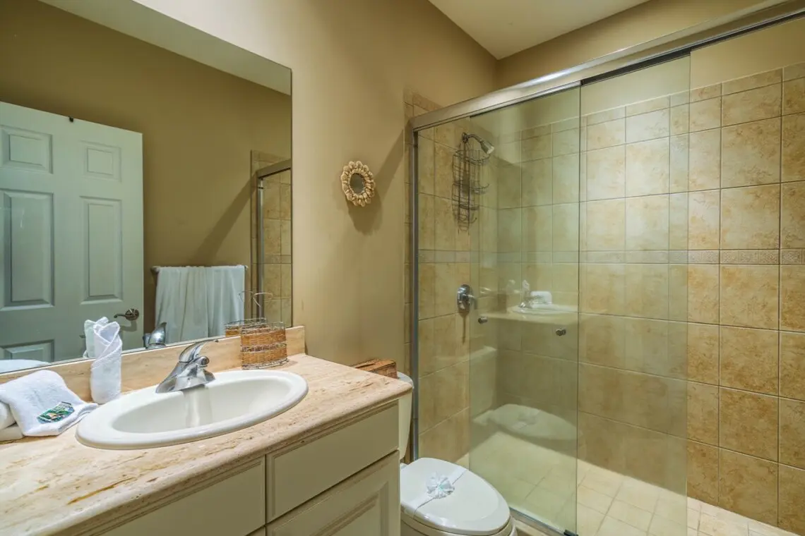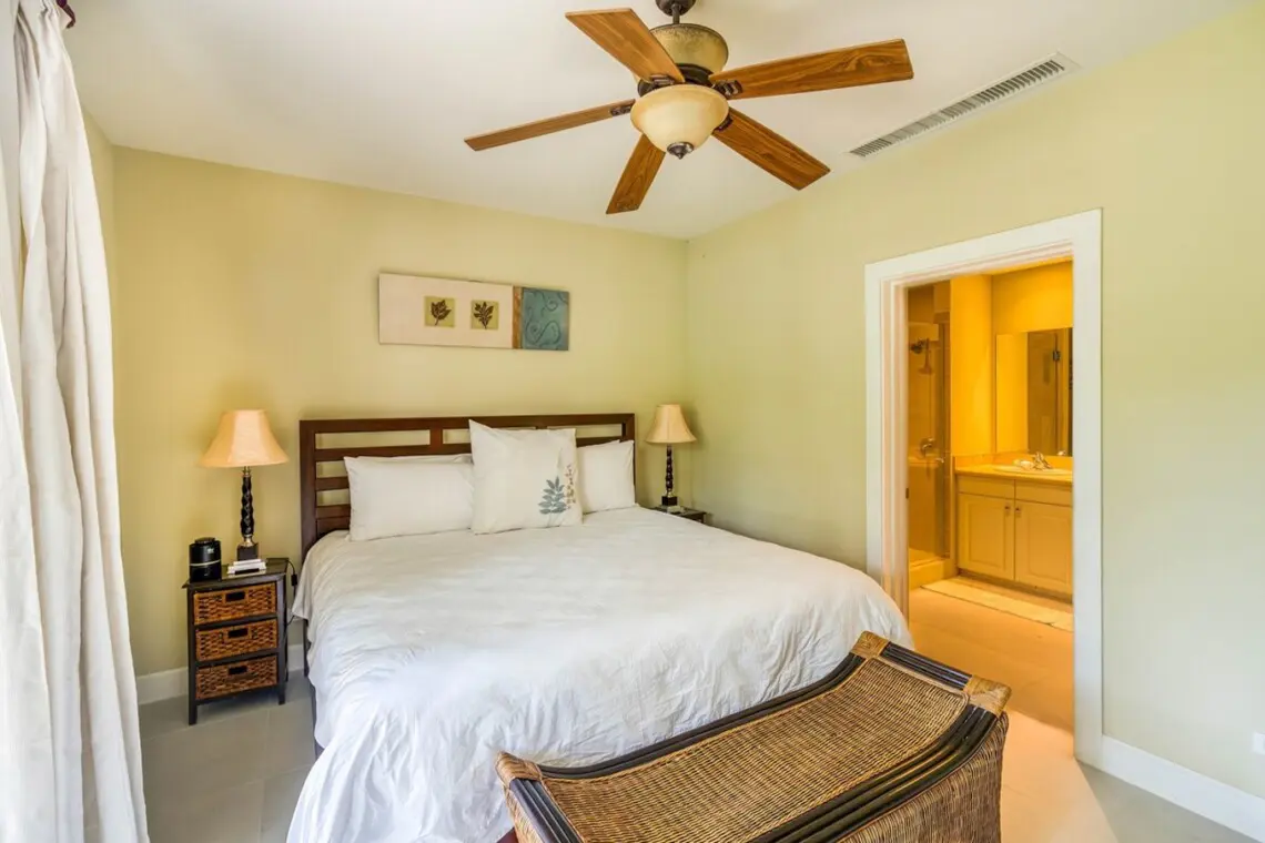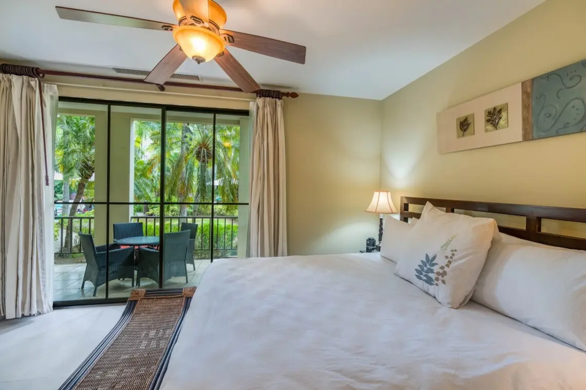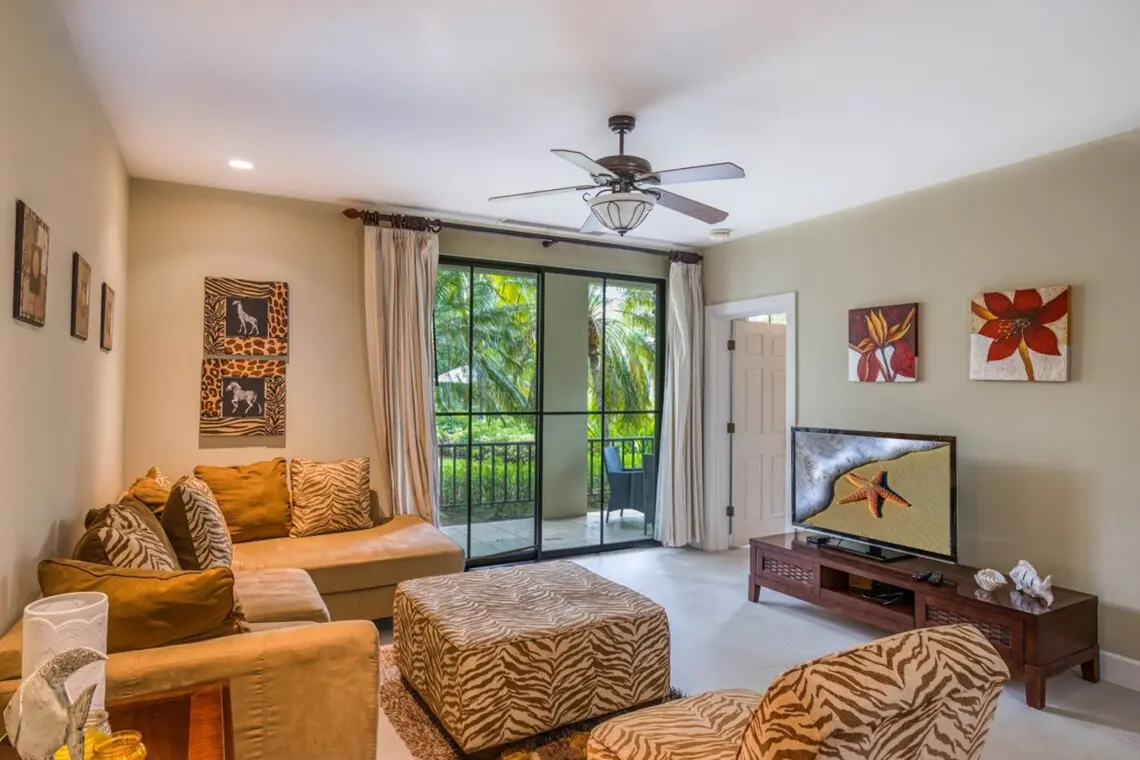 Off of the living area is the primary bedroom with a king bed, rich wood furniture, and an ensuite bathroom with a shower stall and double sinks. This bedroom has patio doors that open to the covered terrace. Back inside, the second and third bedroom sit off the kitchen. The second bedroom has 2 bunk beds and the third bedroom has a queen bed. Just outside these bedrooms is the second full bathroom. The unit has central air and 100MB internet throughout.