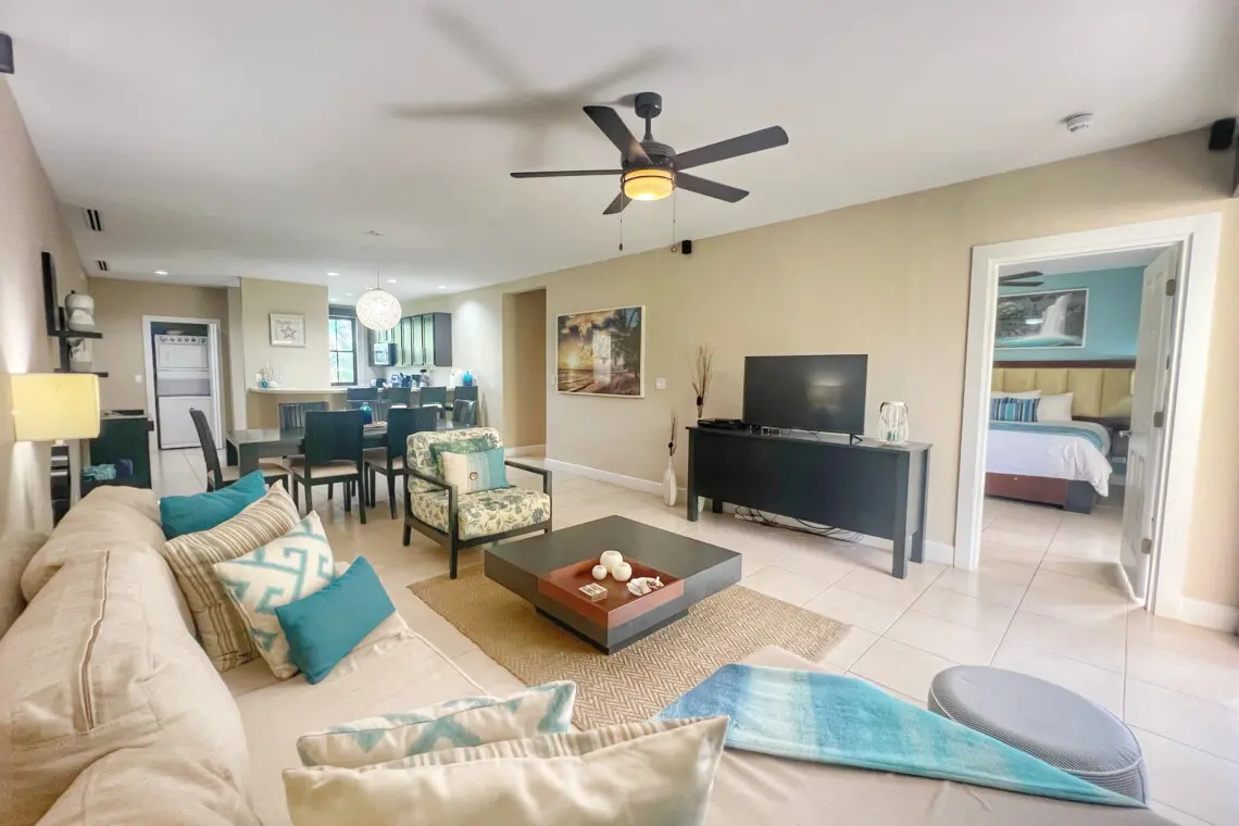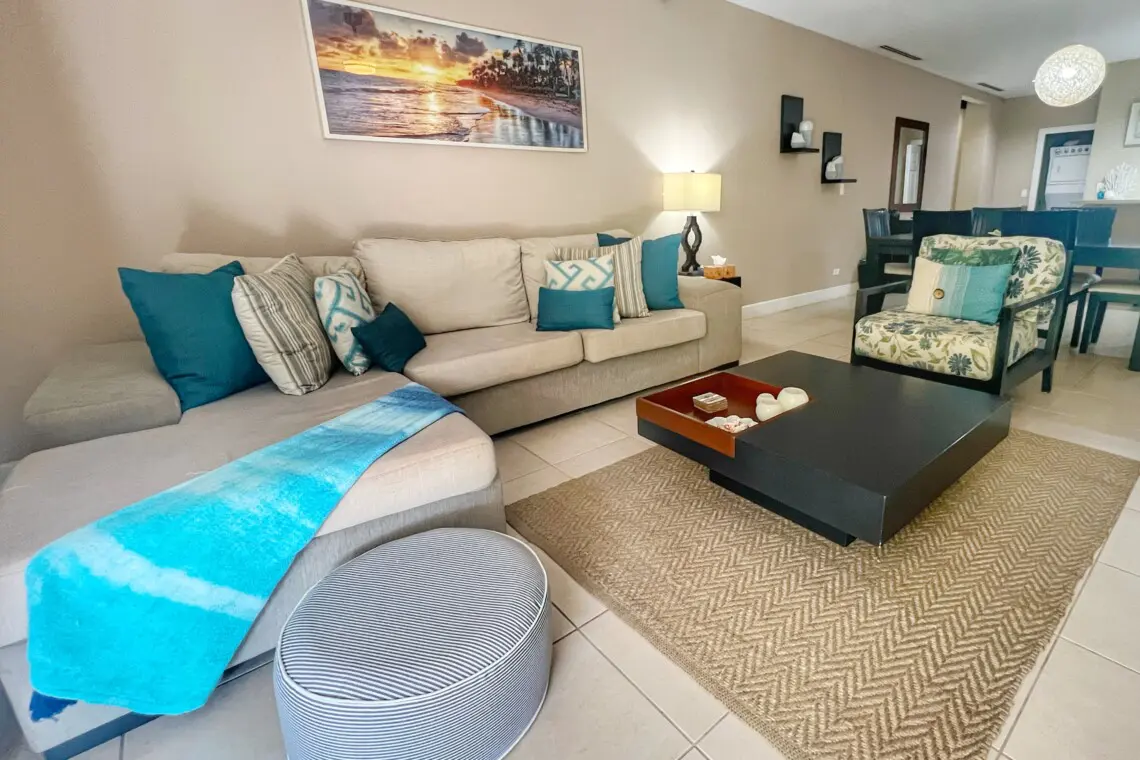The superb condo is a spacious and serene corner unit located on the third floor, boasting 1,600 square feet of luxurious living space. This beautifully designed condo features three bedrooms and two bathrooms, ensuring ample privacy and comfort for all guests.
