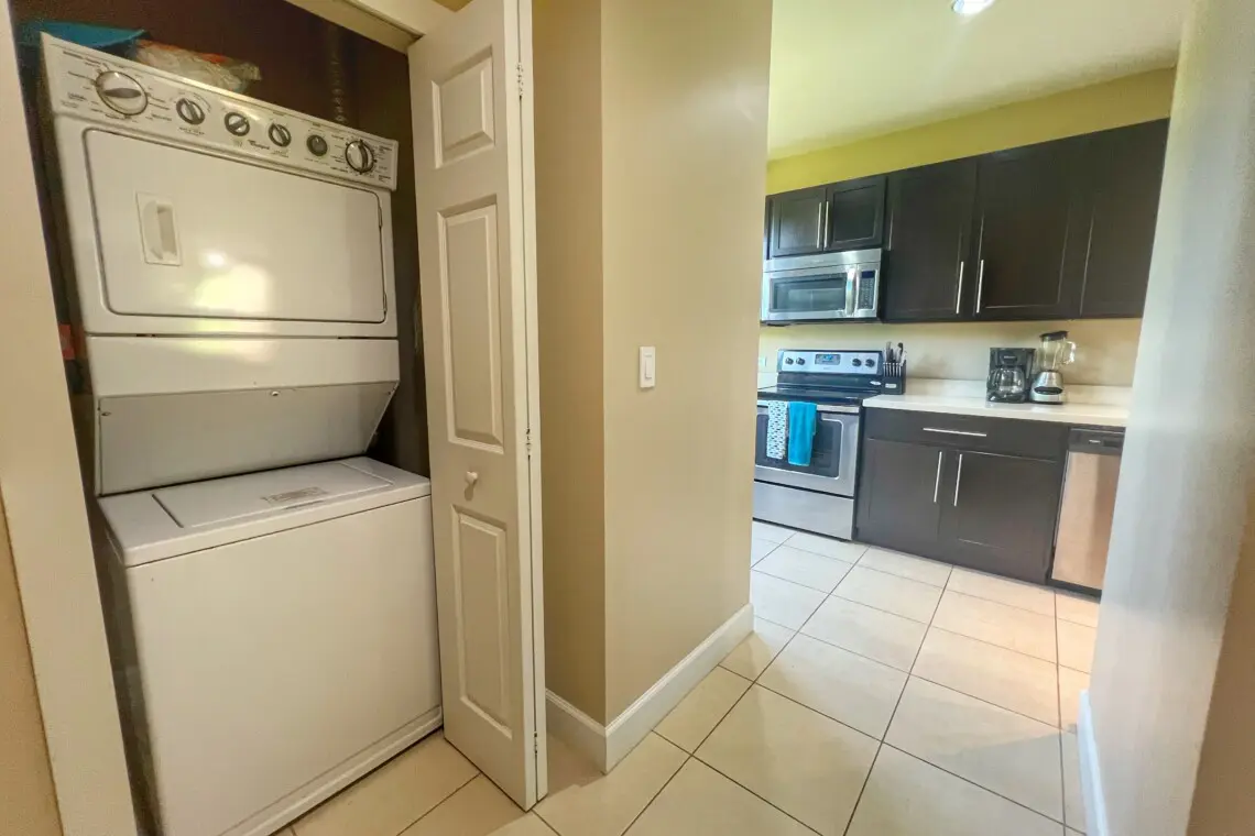 Enjoy an updated kitchen, equipped with sleek stainless steel appliances and a convenient breakfast bar that seats four. Adjacent to the kitchen is a laundry closet with stacked washer/dryer for your convenience. The dining table for six is perfect for family meals or entertaining guests, and the inviting living room is designed for relaxation, featuring a Smart TV and surround sound system, ideal for cozy movie nights or catching up on your favorite shows. Blackout curtains in all bedrooms ensure a restful night’s sleep, with the primary bedroom offering a luxurious king bed, the second bedroom a comfortable queen bed, and the third bedroom two double beds. For families with young children, a pack & play crib is also provided.