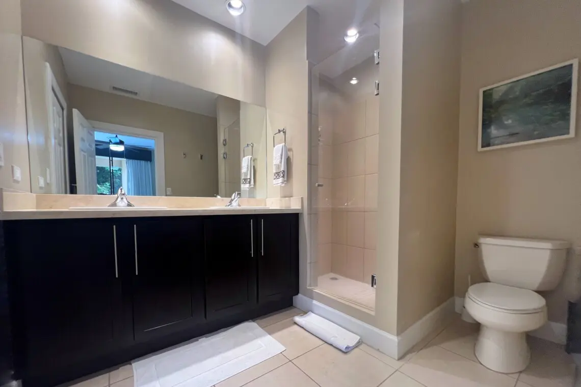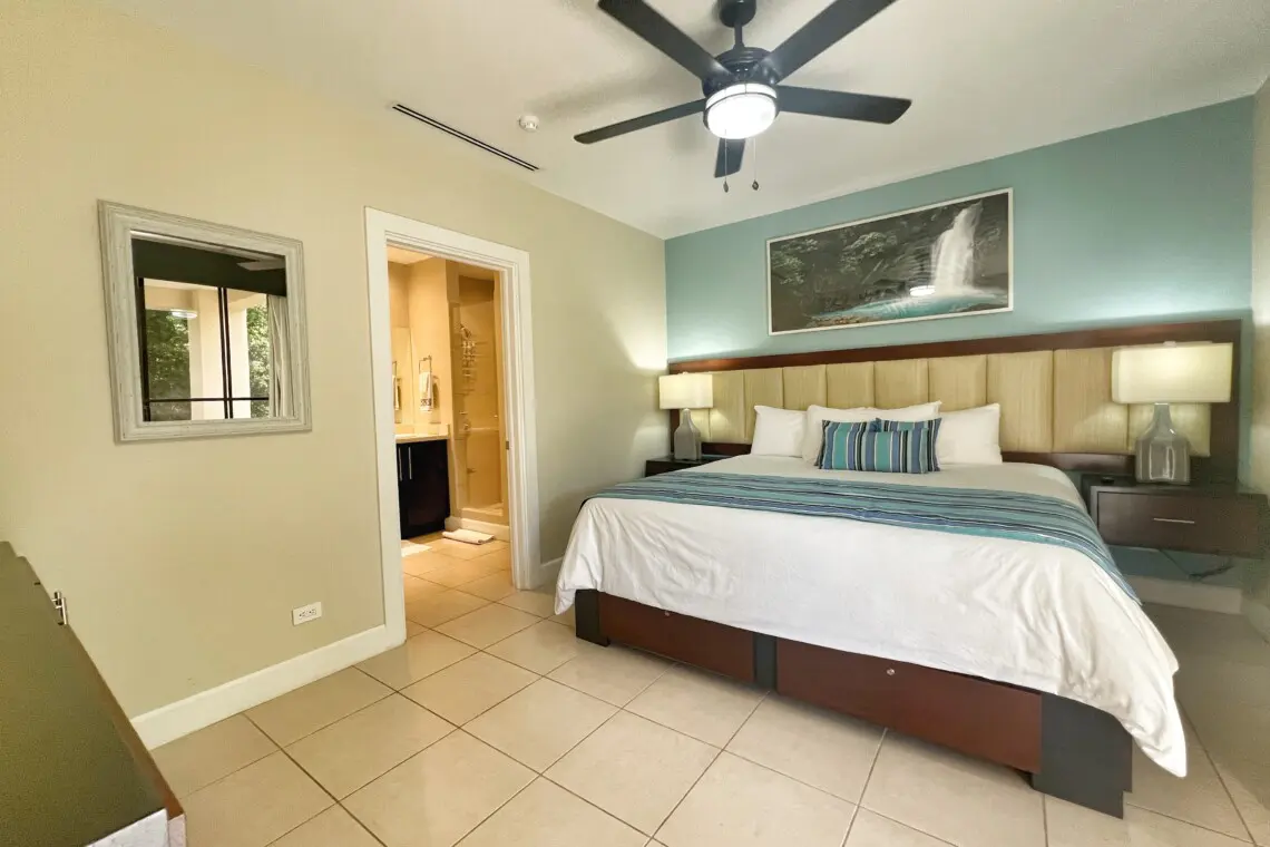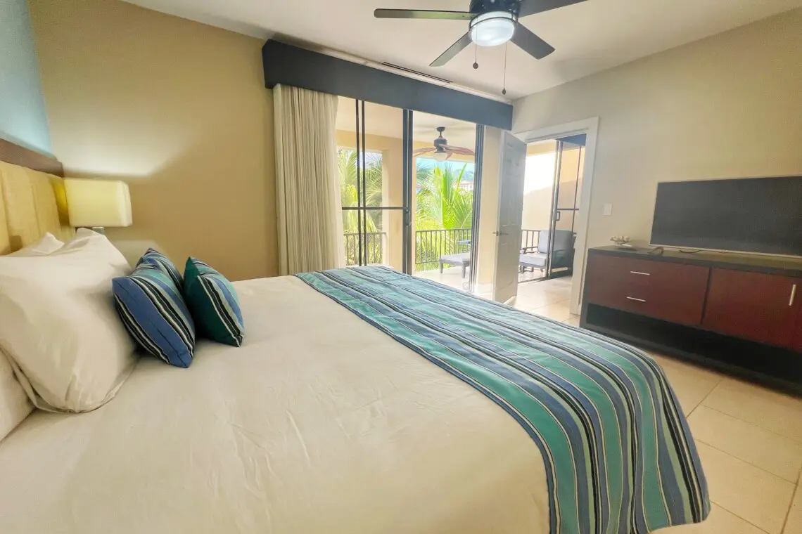 Primary Bedroom – King bed, dresser and walk-in closet, 42″ Smart TV, ensuite bathroom with dual vanities, blackout curtains, access to covered terrace