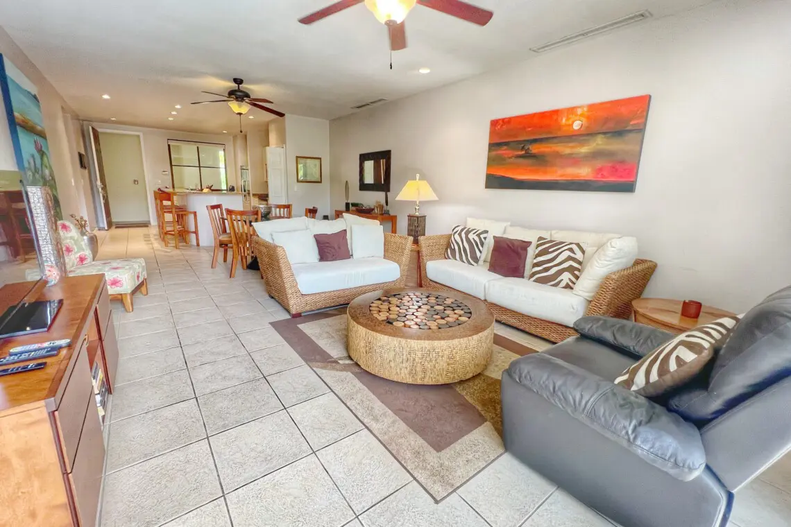 This charming vacation condo offers a perfect blend of comfort and luxury with its tropical decor and spacious layout. Situated on the second floor, this 1,350-square-foot unit boasts two bedrooms and two bathrooms, making it ideal for families or groups of friends.