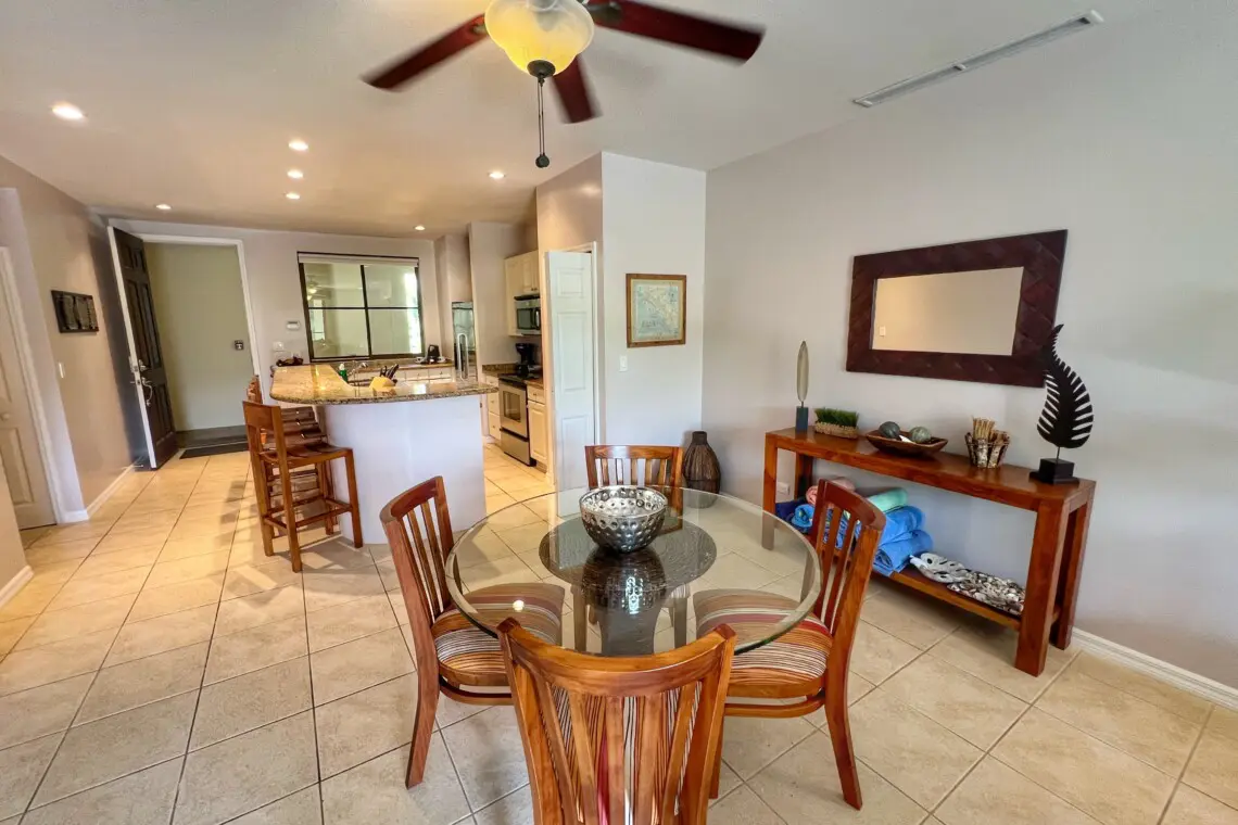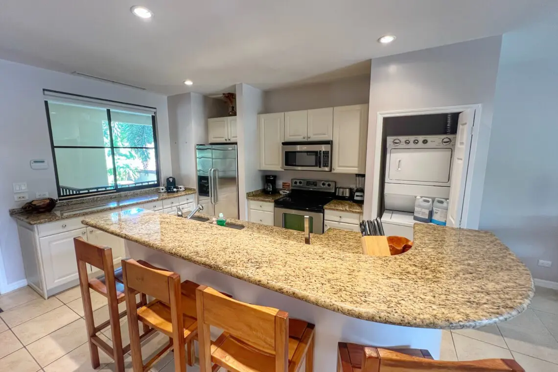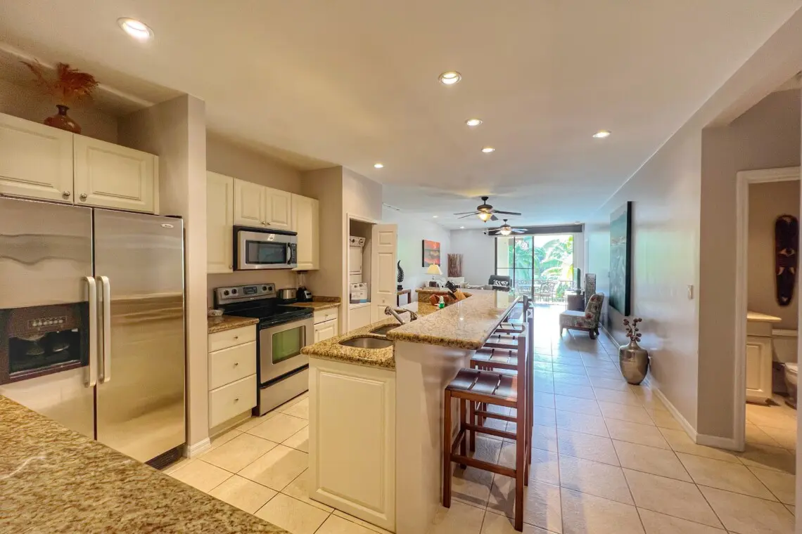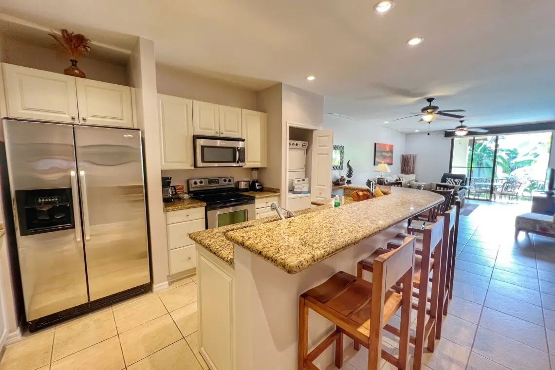The open-concept kitchen, living, and dining areas create a welcoming space for relaxation and entertainment. The fully equipped kitchen features stainless steel full-sized appliances and granite countertops, while the inside dining area comfortably seats four. The condo’s interior exudes a tropical ambiance, enhancing the vacation vibe.