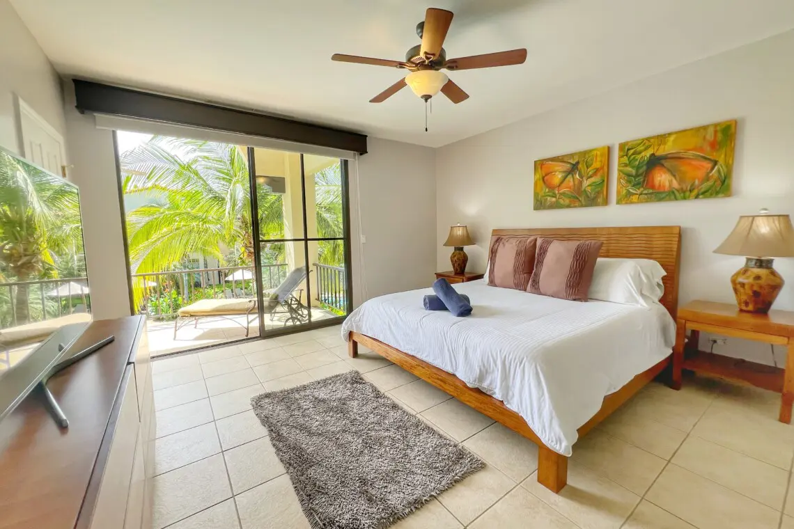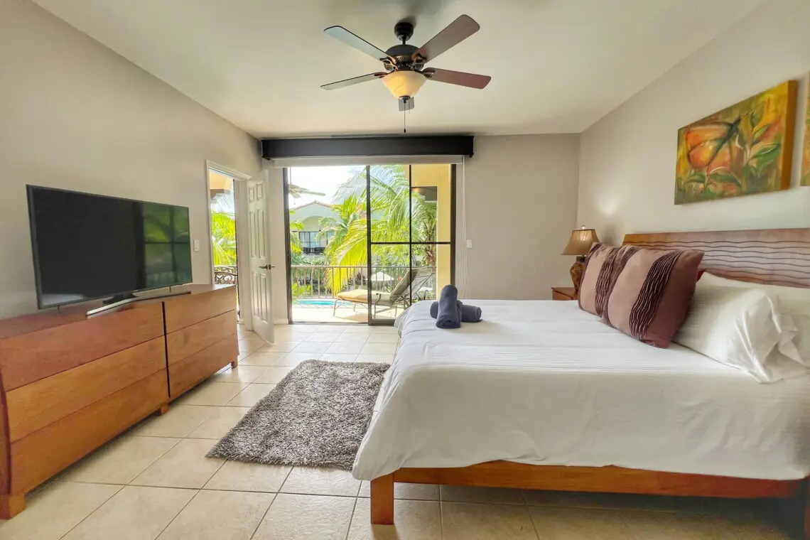 Primary Bedroom – King bed, terrace access, Smart TV, ensuite bathroom with walk-in closet