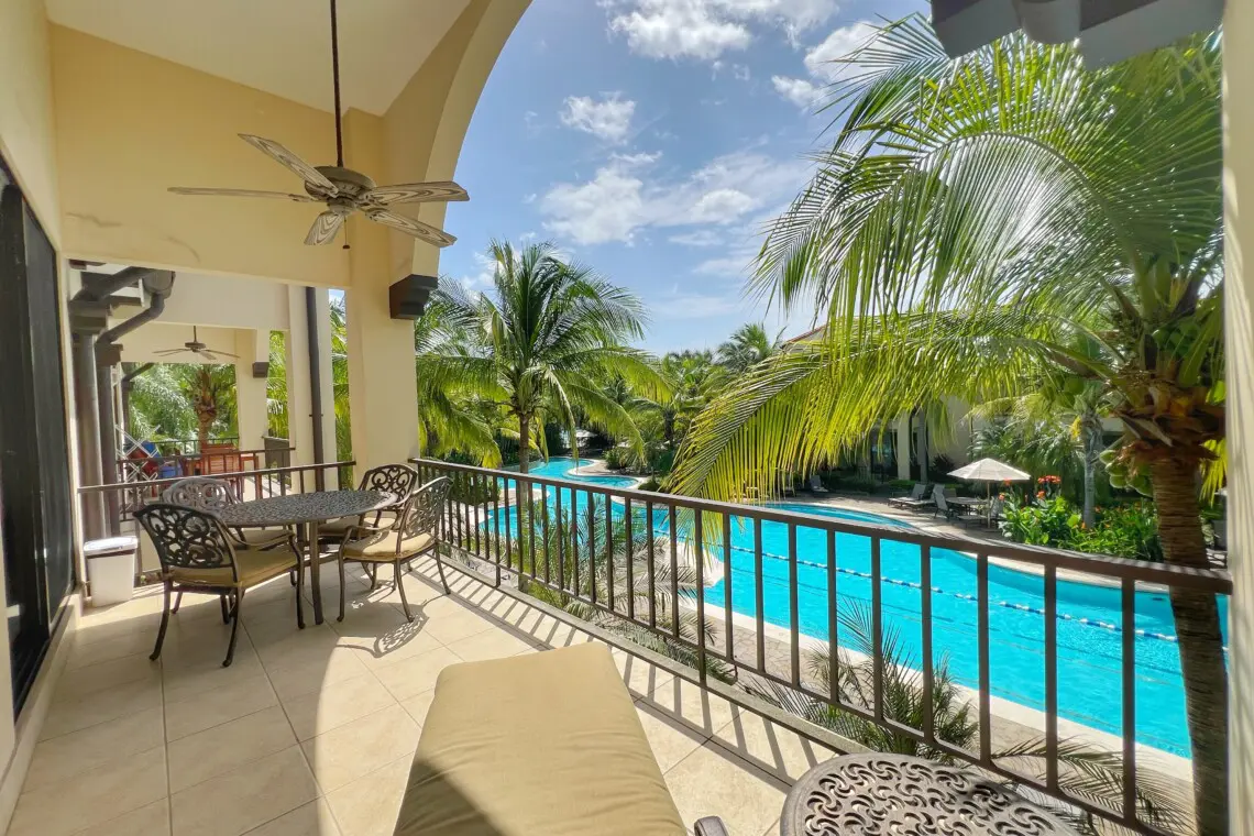 One of the highlights of this condo is its large terrace, which overlooks the sparkling pools below. The terrace is equipped with a dining table, providing a shaded retreat in the morning and partial sun in the afternoon, perfect for enjoying meals or a refreshing drink outdoors. Located within a gated and secure resort-style community, building L4 sits right next to the pedestrian gate for excellent walkability. This prime location ensures that guests can easily explore the surrounding area, making it an ideal base for a tropical getaway.
