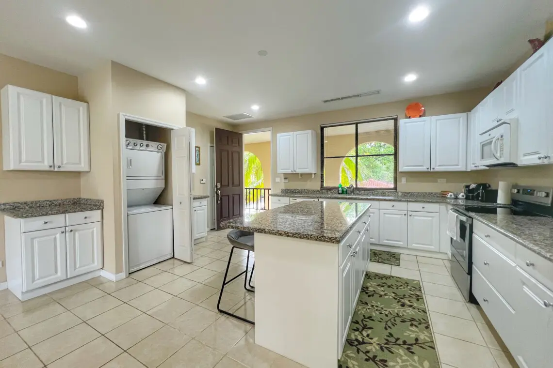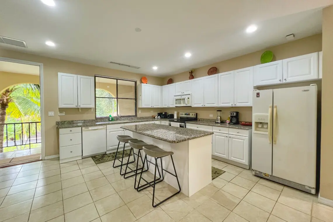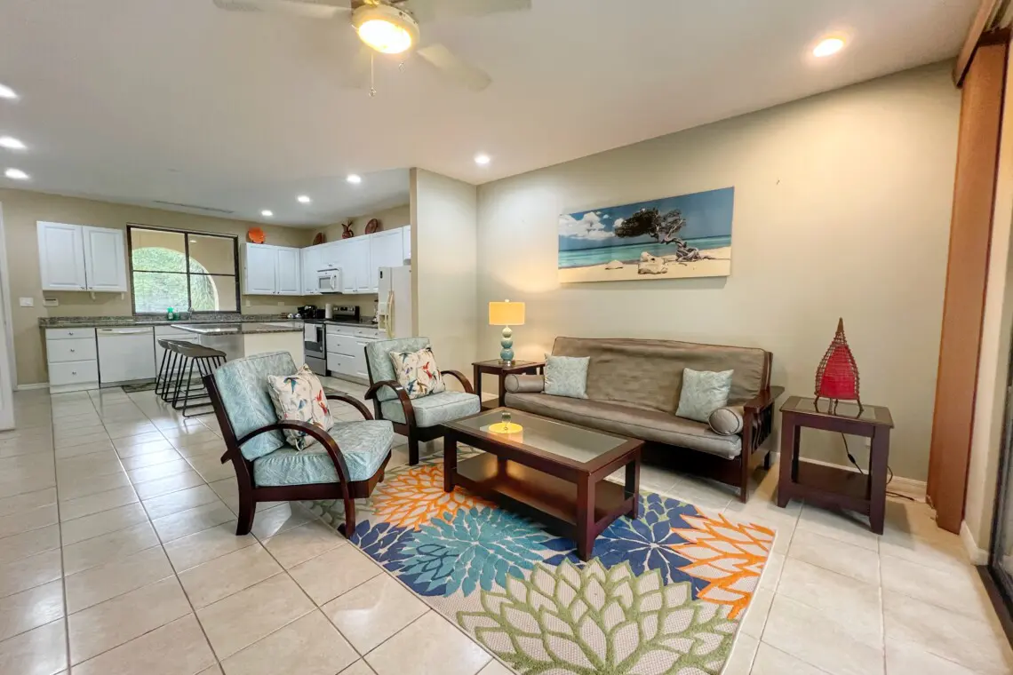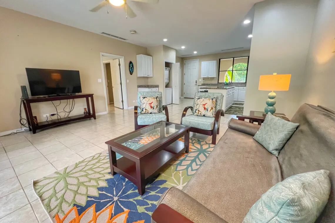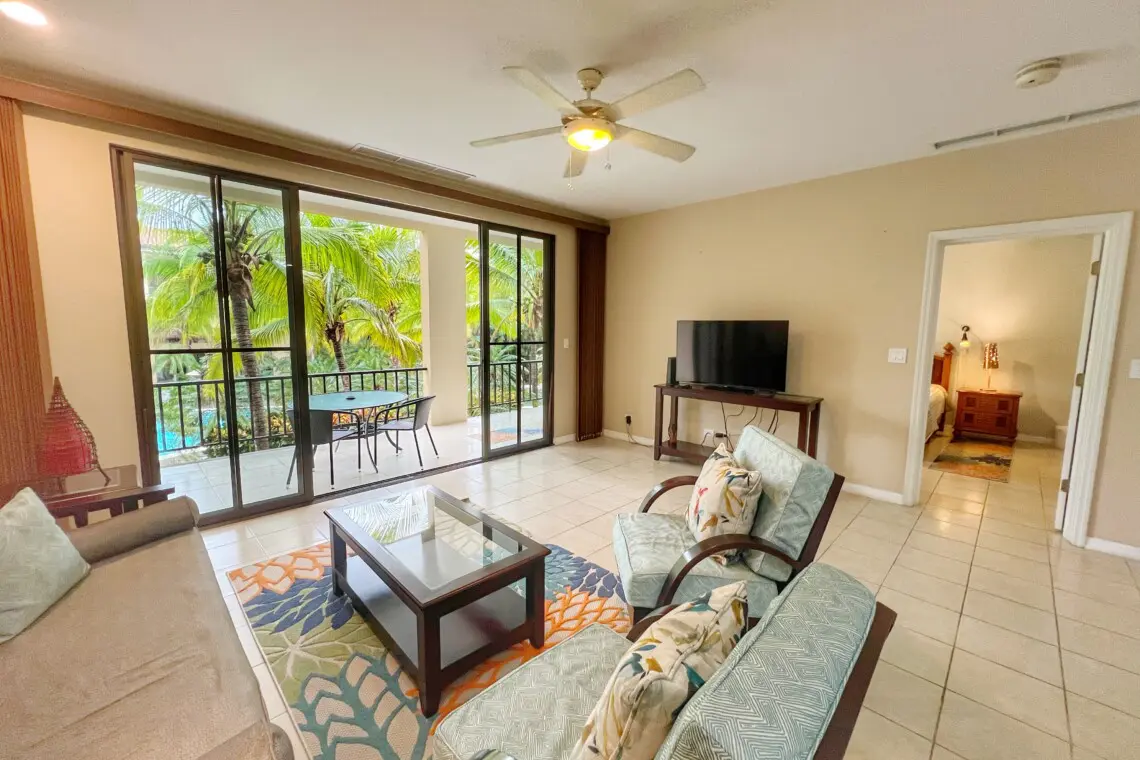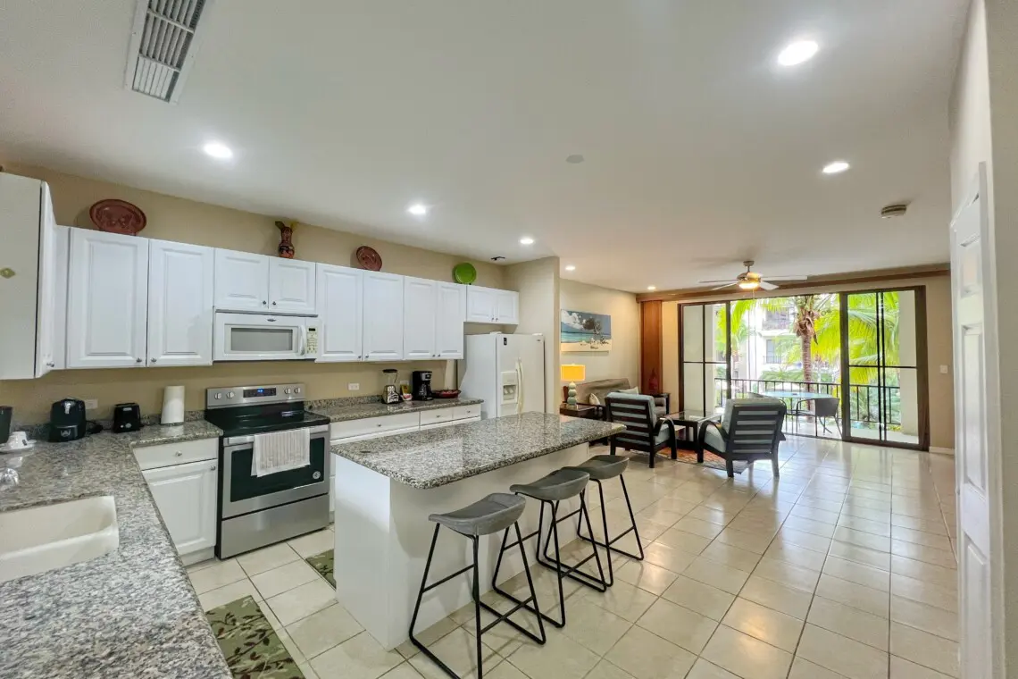 The living space is bright and spacious with a large L-shaped kitchen and island with seating for 3. Beyond that is the living space and the massive covered terrace that spans across both the living room and primary bedroom. Outside there is dining space for 4 and a lounger for catching some rays, reading a book or an afternoon nap … you are on vacation after all!