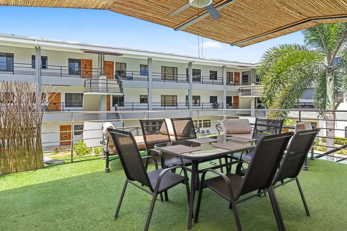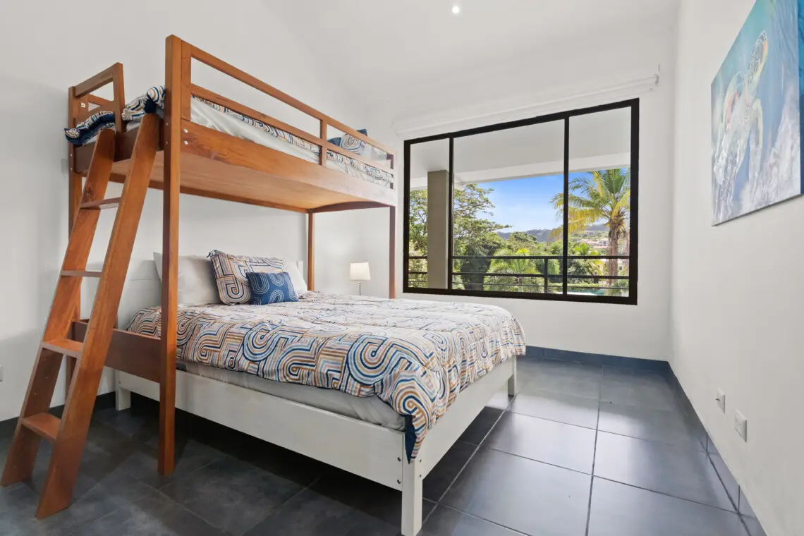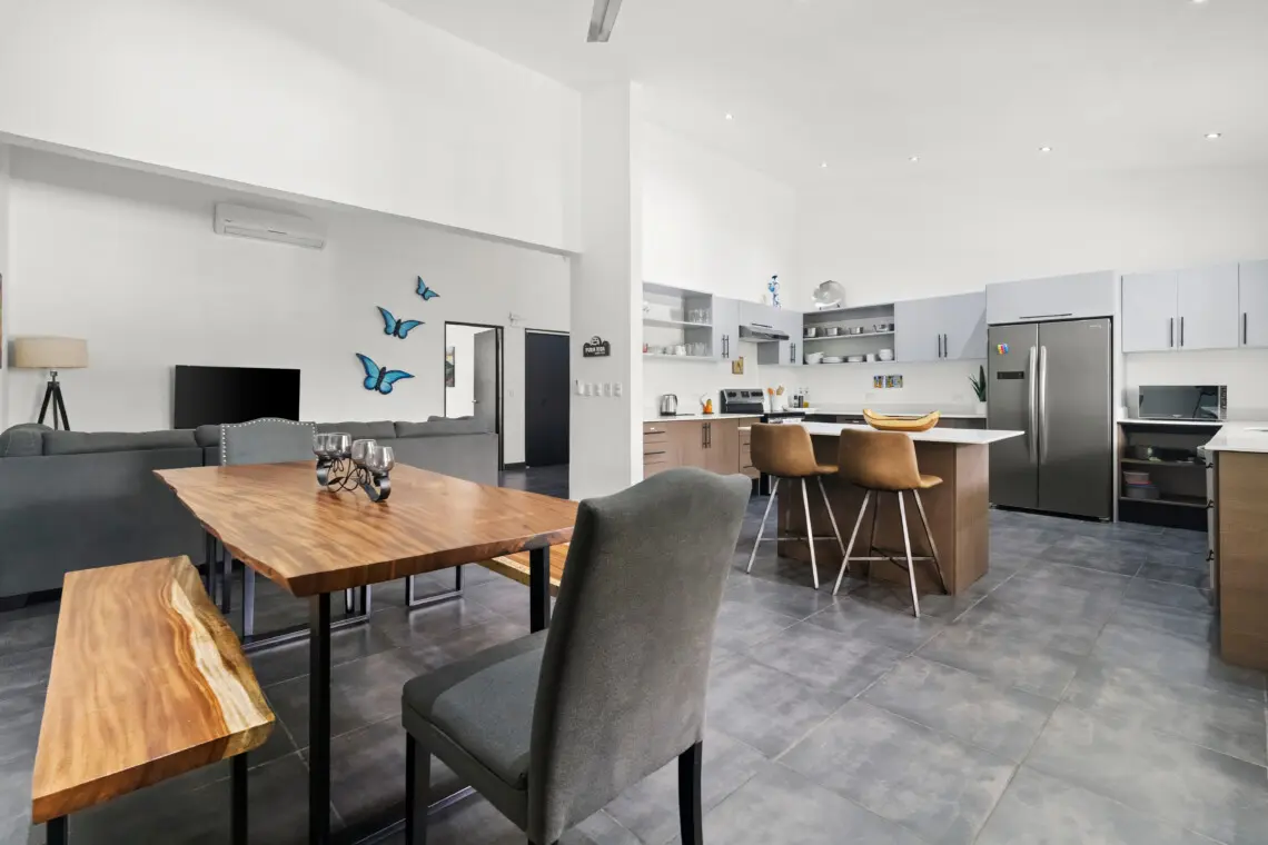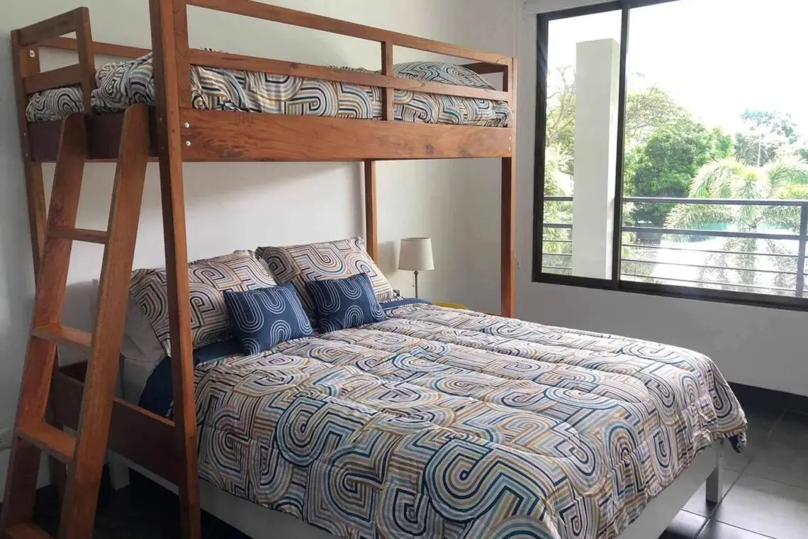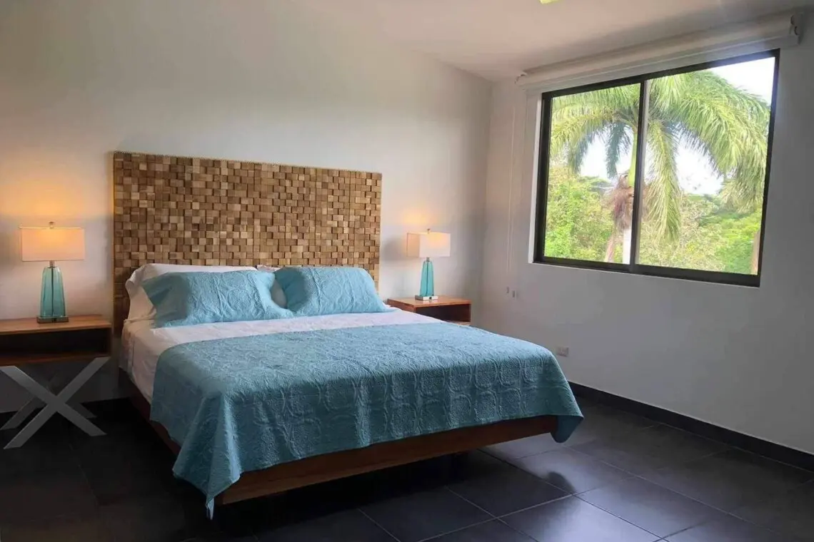 This bright, top-floor condo combines comfort, space, and location for a relaxing stay in Playas del Coco. The open-concept kitchen, dining, and living area features vaulted ceilings, a Smart TV, and plenty of natural light. The large, fully equipped kitchen makes it easy to cook and share meals together.