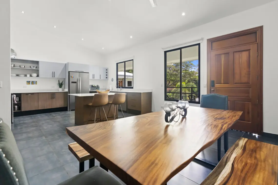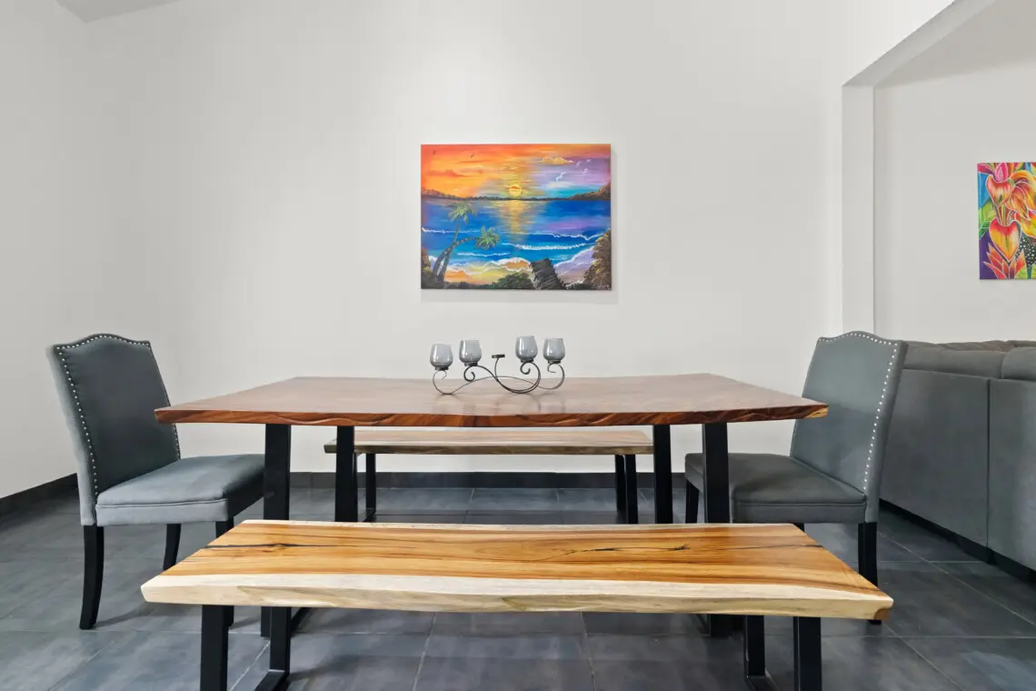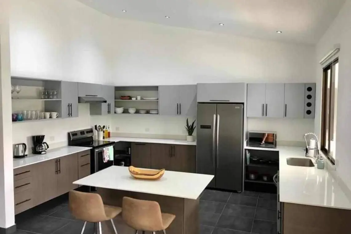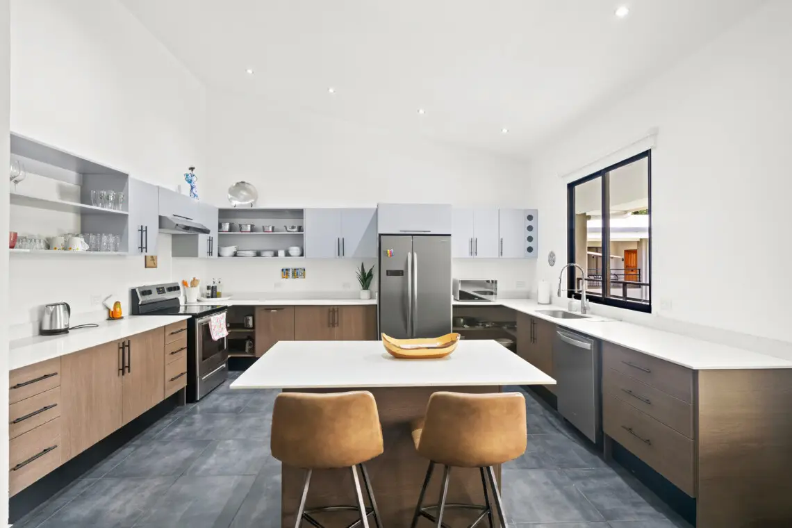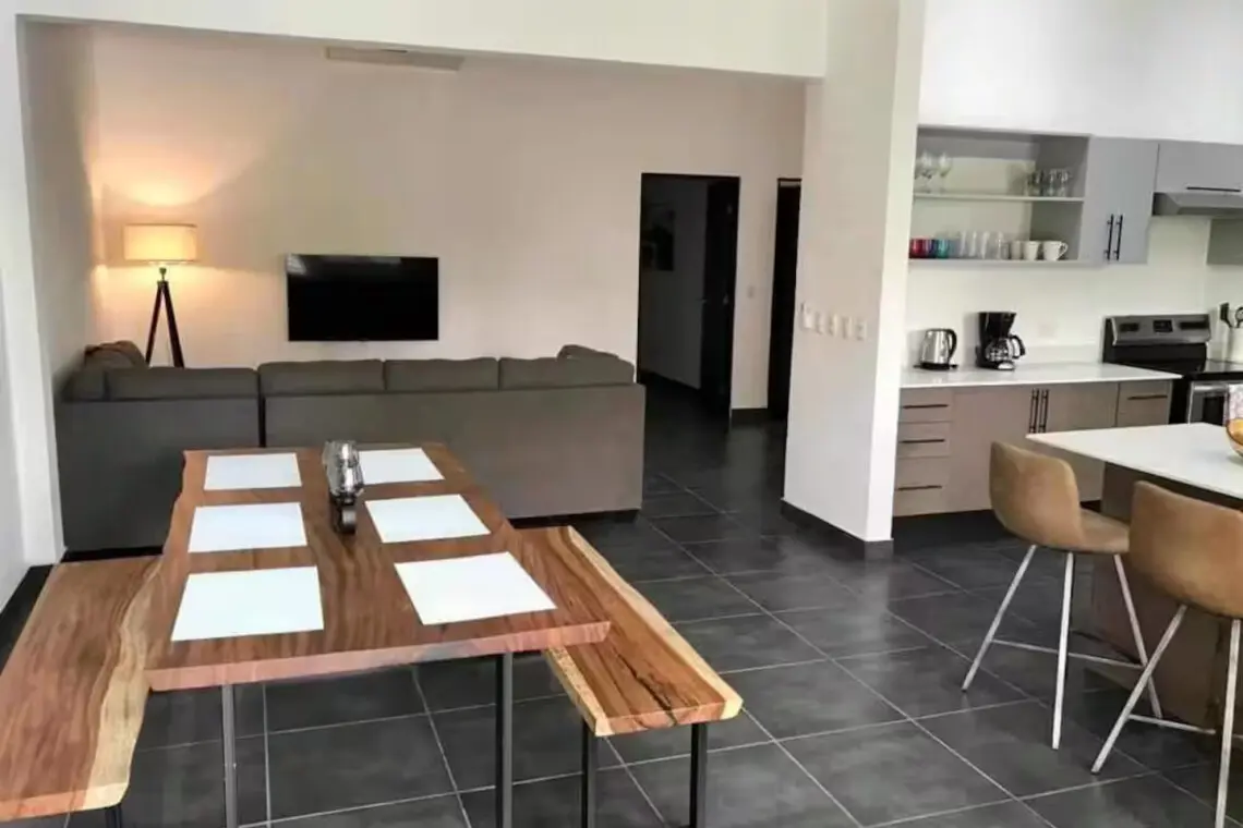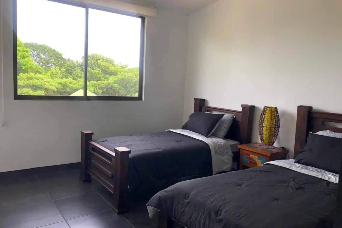 This bright, top-floor condo combines comfort, space, and location for a relaxing stay in Playas del Coco. The open-concept kitchen, dining, and living area features vaulted ceilings, a Smart TV, and plenty of natural light. The large, fully equipped kitchen makes it easy to cook and share meals together.