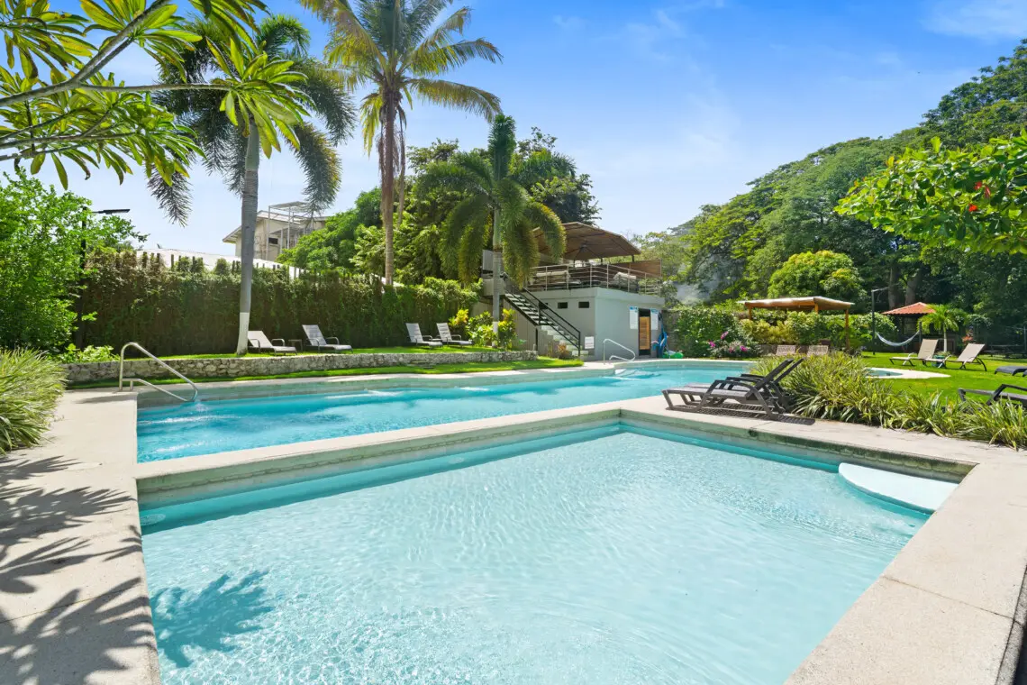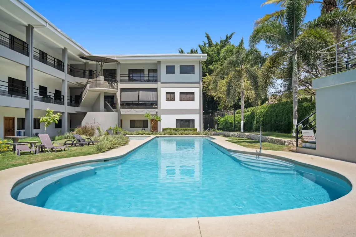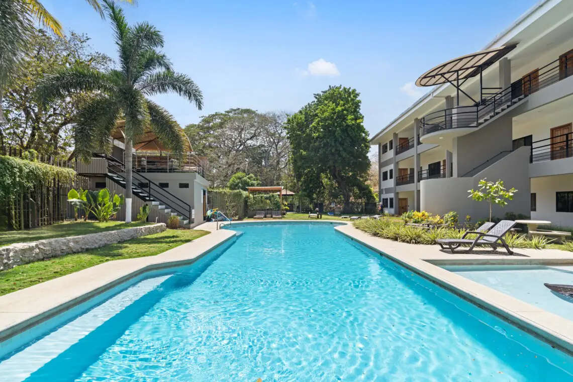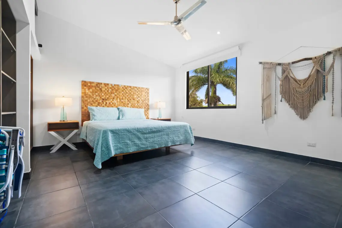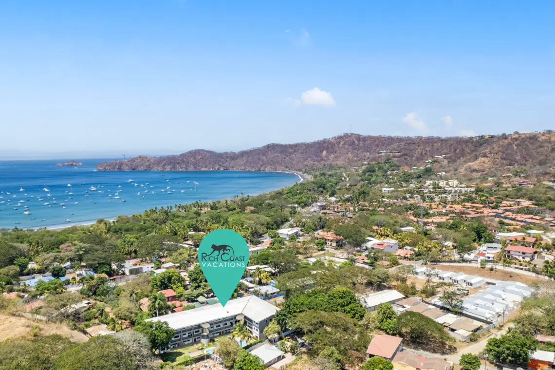 This bright, top-floor condo combines comfort, space, and location for a relaxing stay in Playas del Coco. The open-concept kitchen, dining, and living area features vaulted ceilings, a Smart TV, and plenty of natural light. The large, fully equipped kitchen makes it easy to cook and share meals together.