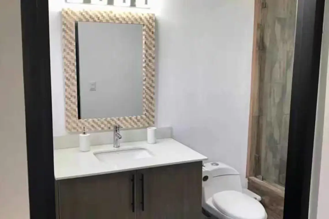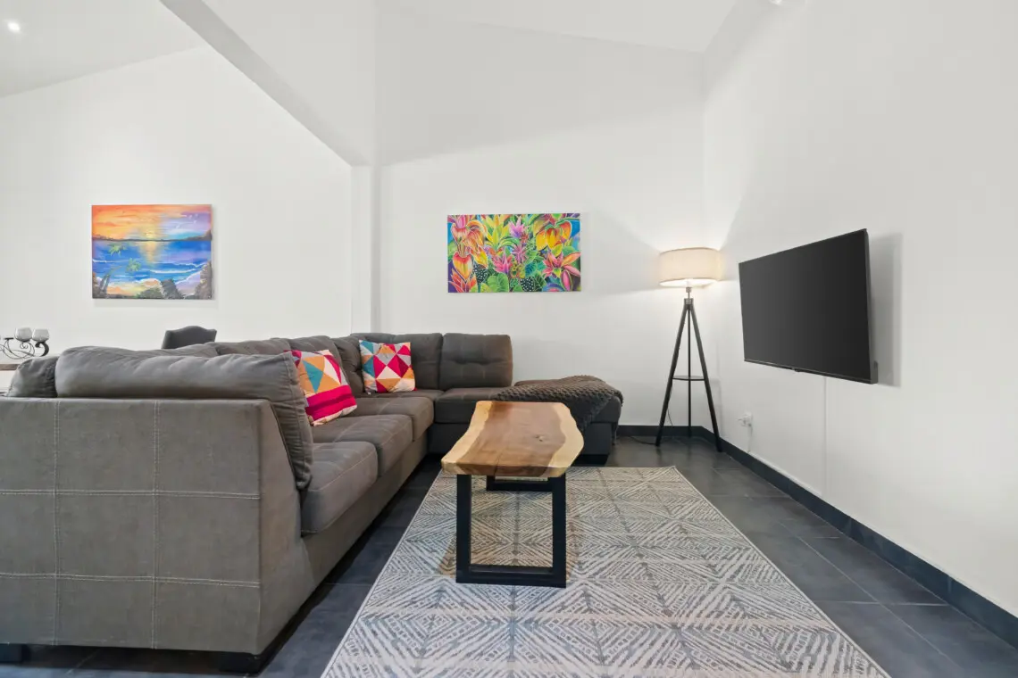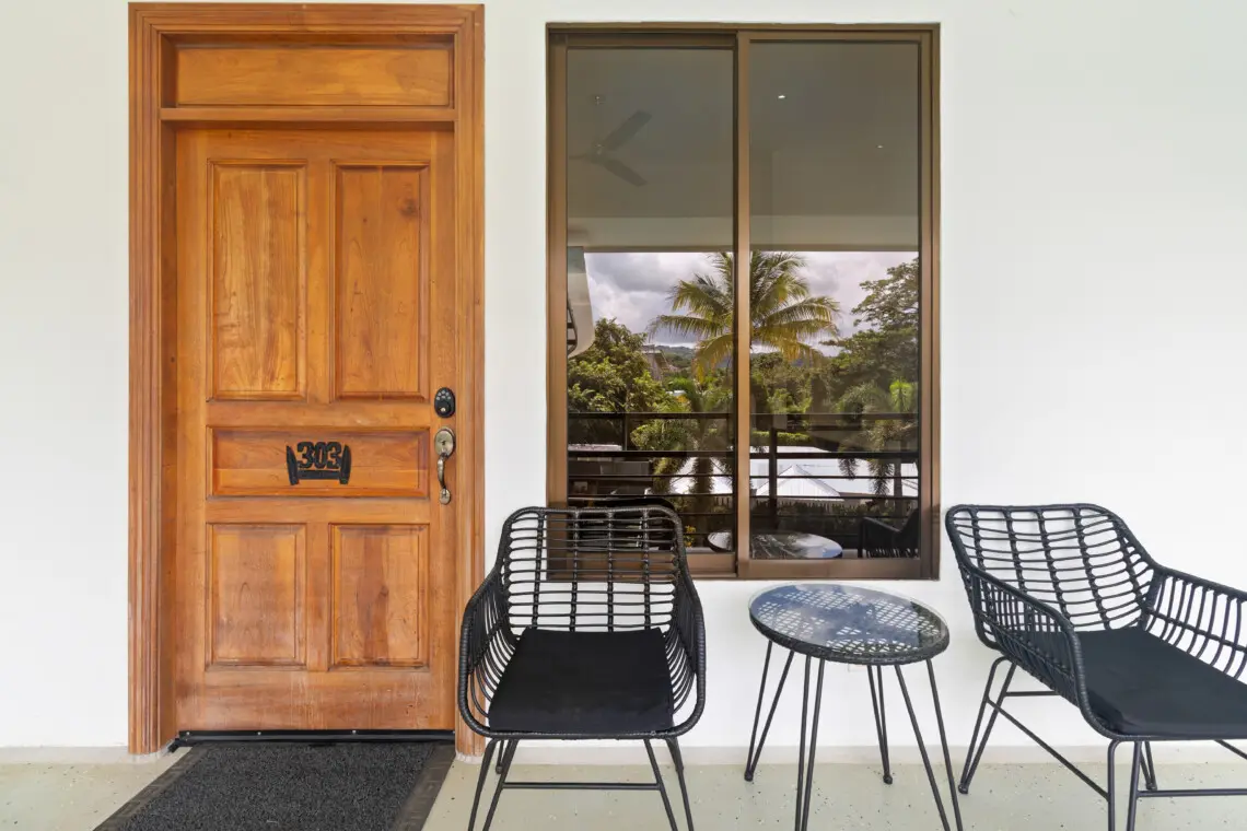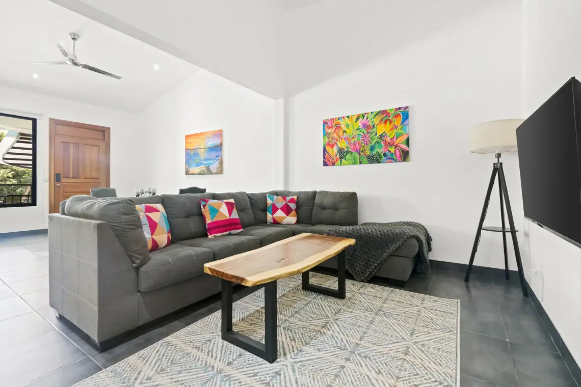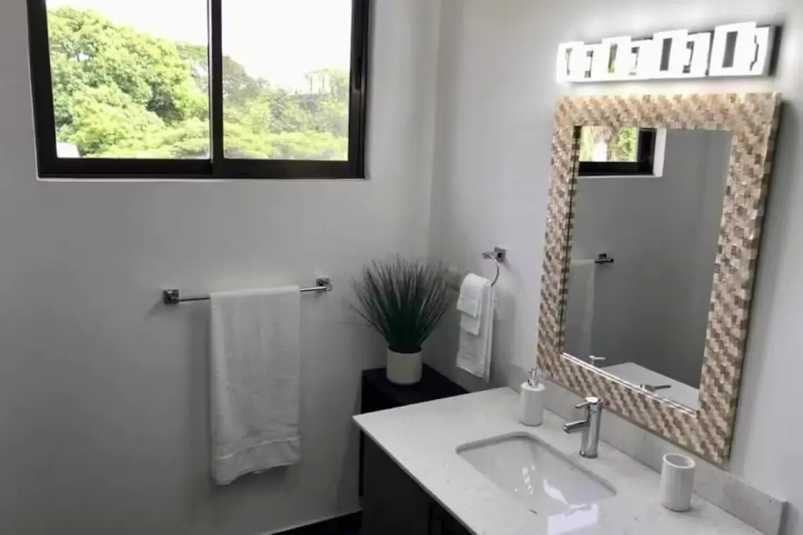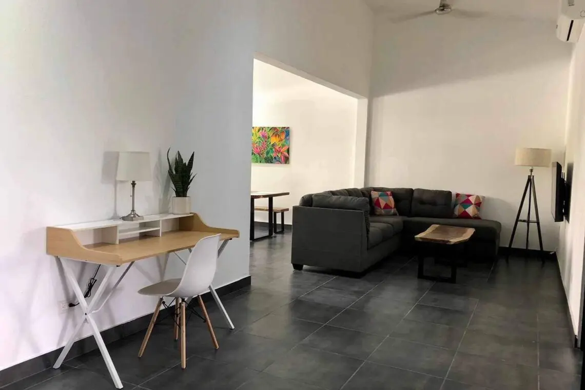 This bright, top-floor condo combines comfort, space, and location for a relaxing stay in Playas del Coco. The open-concept kitchen, dining, and living area features vaulted ceilings, a Smart TV, and plenty of natural light. The large, fully equipped kitchen makes it easy to cook and share meals together.