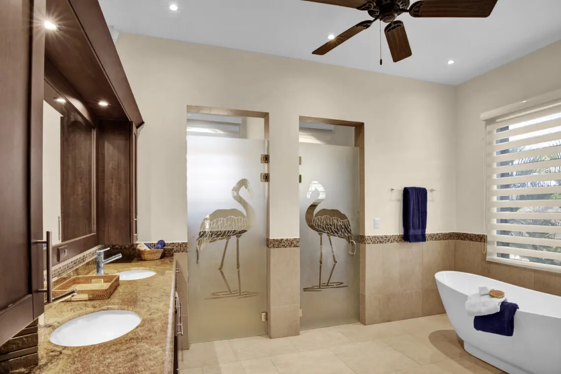 – Primary Bedroom – King Bed, Smart TV, ocean views, pool access, custom-built walk-in closet, ensuite bathroom with double vanity, shower, water closet and free-standing bathtub, ductless A/C unit