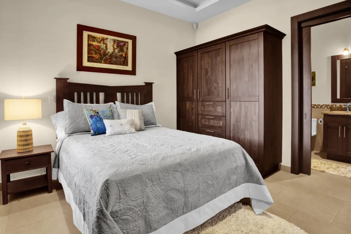 – Poolside Apartment – King Bed, ocean view balcony, custom-built closet, 42″ Smart TV ensuite bathroom with shower stall, kitchen with full-size stove, fridge, and microwave, ductless A/C unit.