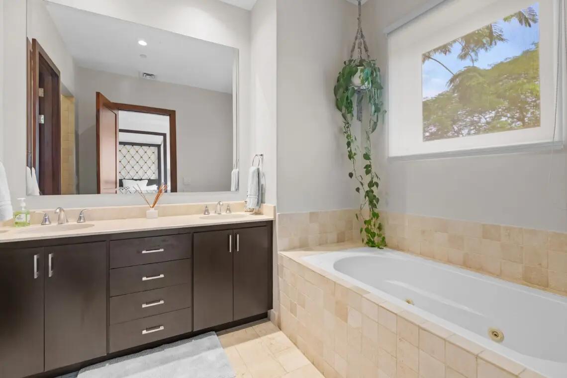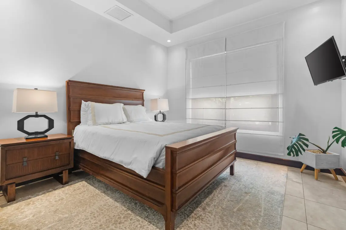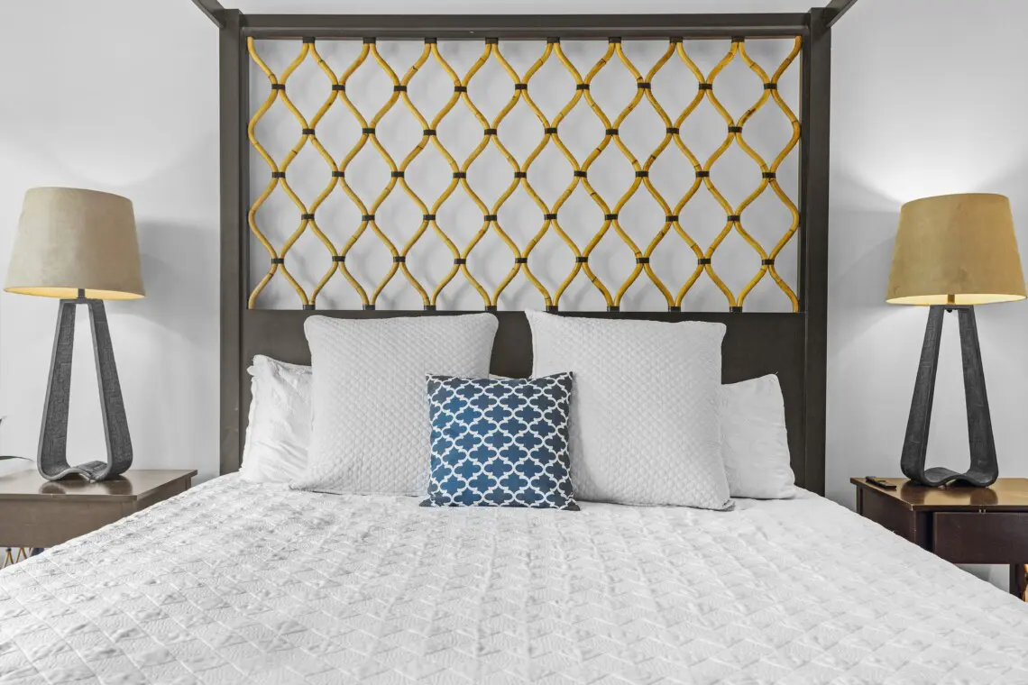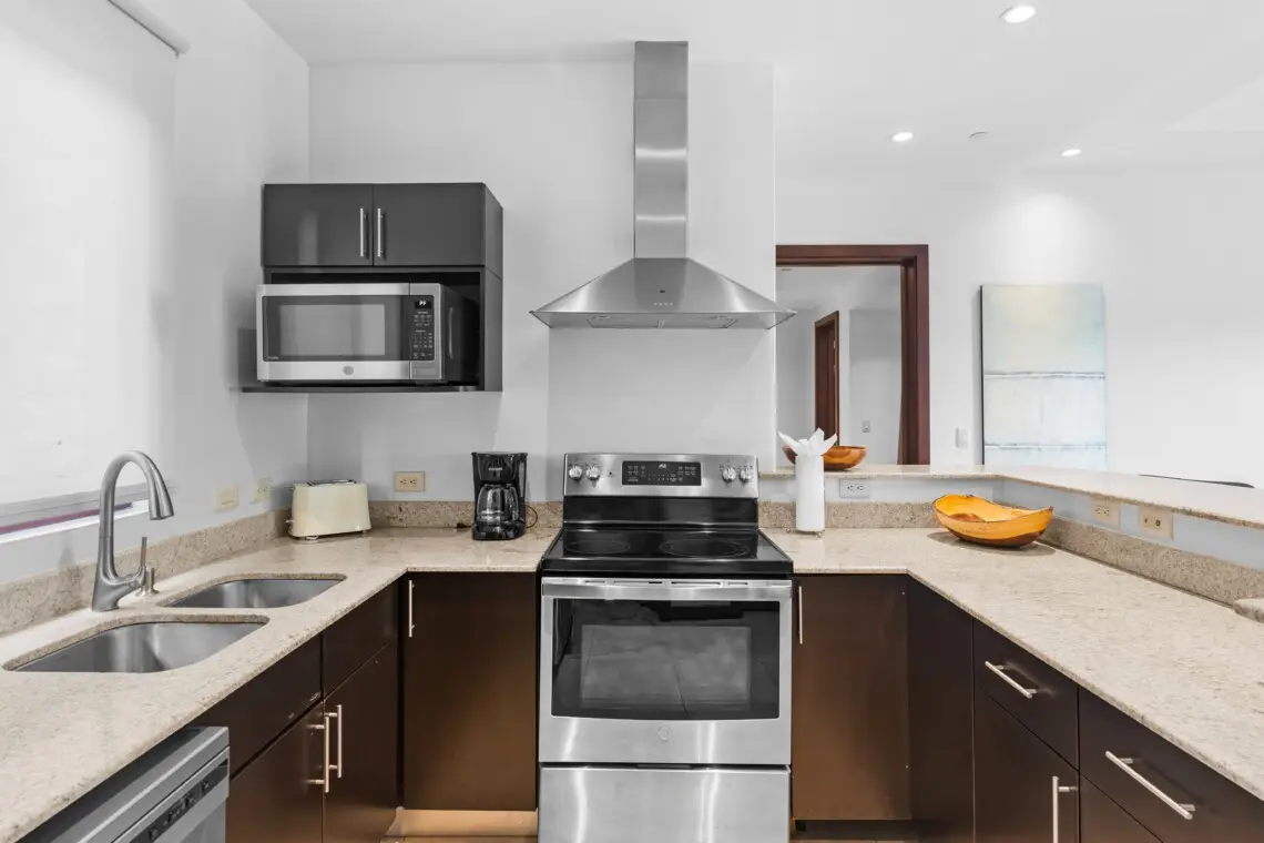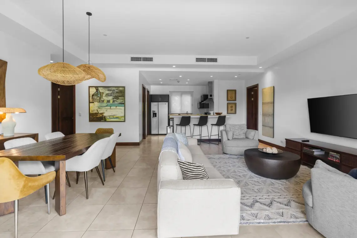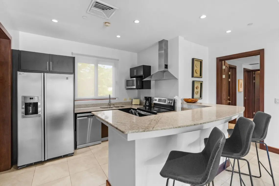 Situated on the third floor, accessible by elevator, the spacious condo has beautiful decor and ample space for a comfortable stay. The unit boasts three bedrooms and two and a half bathrooms, including a primary suite with smart TV and ensuite bathroom. The private balcony is a highlight, equipped with a cozy daybed, dining table for six, and a gas BBQ—ideal for al fresco dining while soaking in the tranquil ambiance. Inside, the living room invites you to unwind with a 65″ Smart TV, while the dining area comfortably seats six for family meals or entertaining guests. The well-equipped kitchen features modern appliances and a breakfast bar for three, making meal preparation a delight.